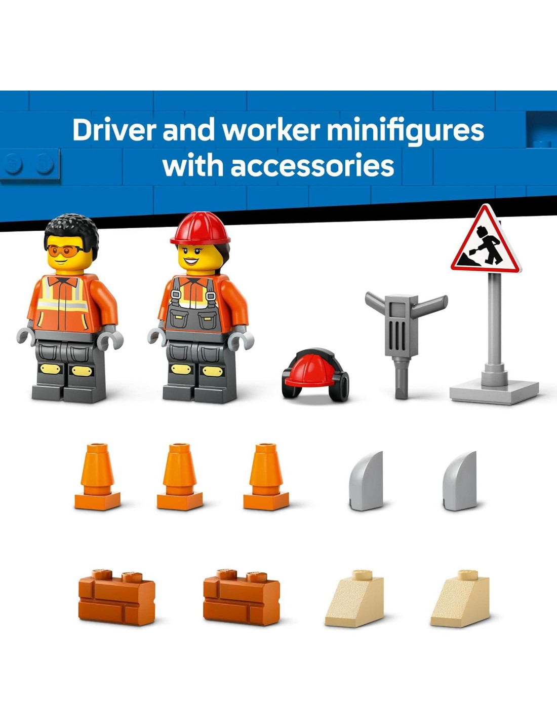 - ACCESORIOS Y MINIFIGURAS - Este juguete de camión de construcción incluye una cargadora de juguete construible, minifiguras de conductor y trabajador, un letrero de trabajo en la carretera, conos de tráfico y un martillo neumático de juguete
