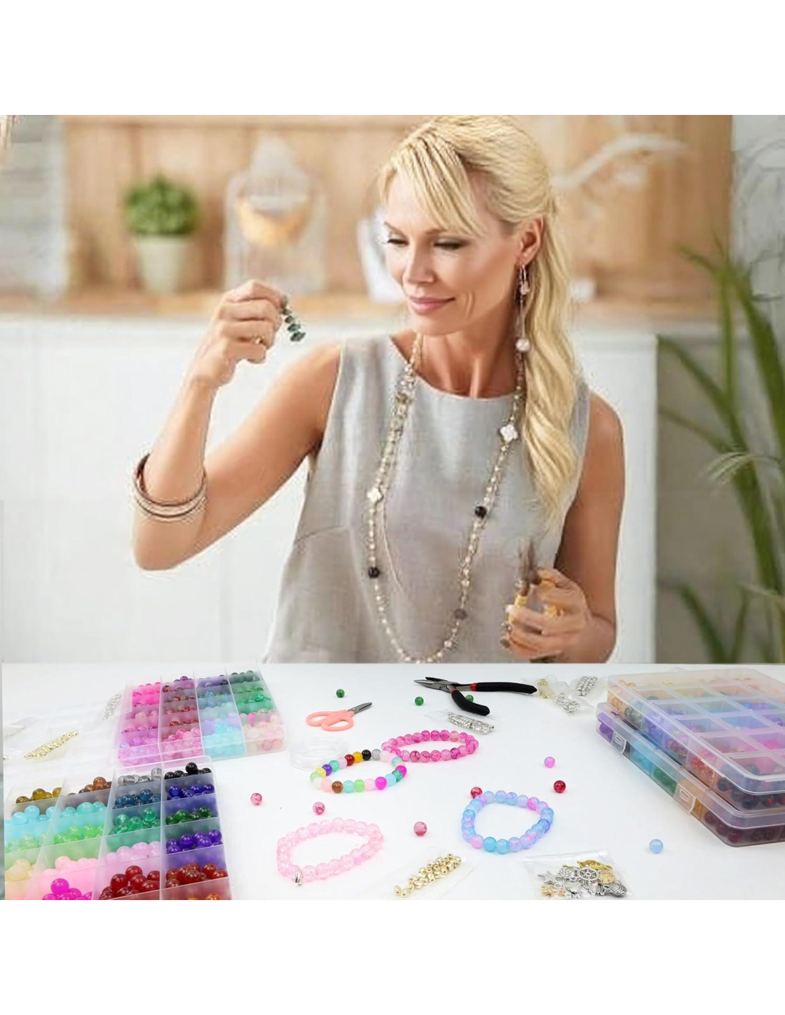 Las bolas de vidrio tienen una amplia gama de usos. Puedes usarlas para hacer obras únicas de bricolaje para llevar o decorar, como pulseras, collares, aretes, llaveros, etc. El set viene con cuerda elástica, alicates, tijeras y un enhebrador de cuentas. Por favor, usa tu creatividad e imaginación para hacer una obra única de cuentas hecha a mano.