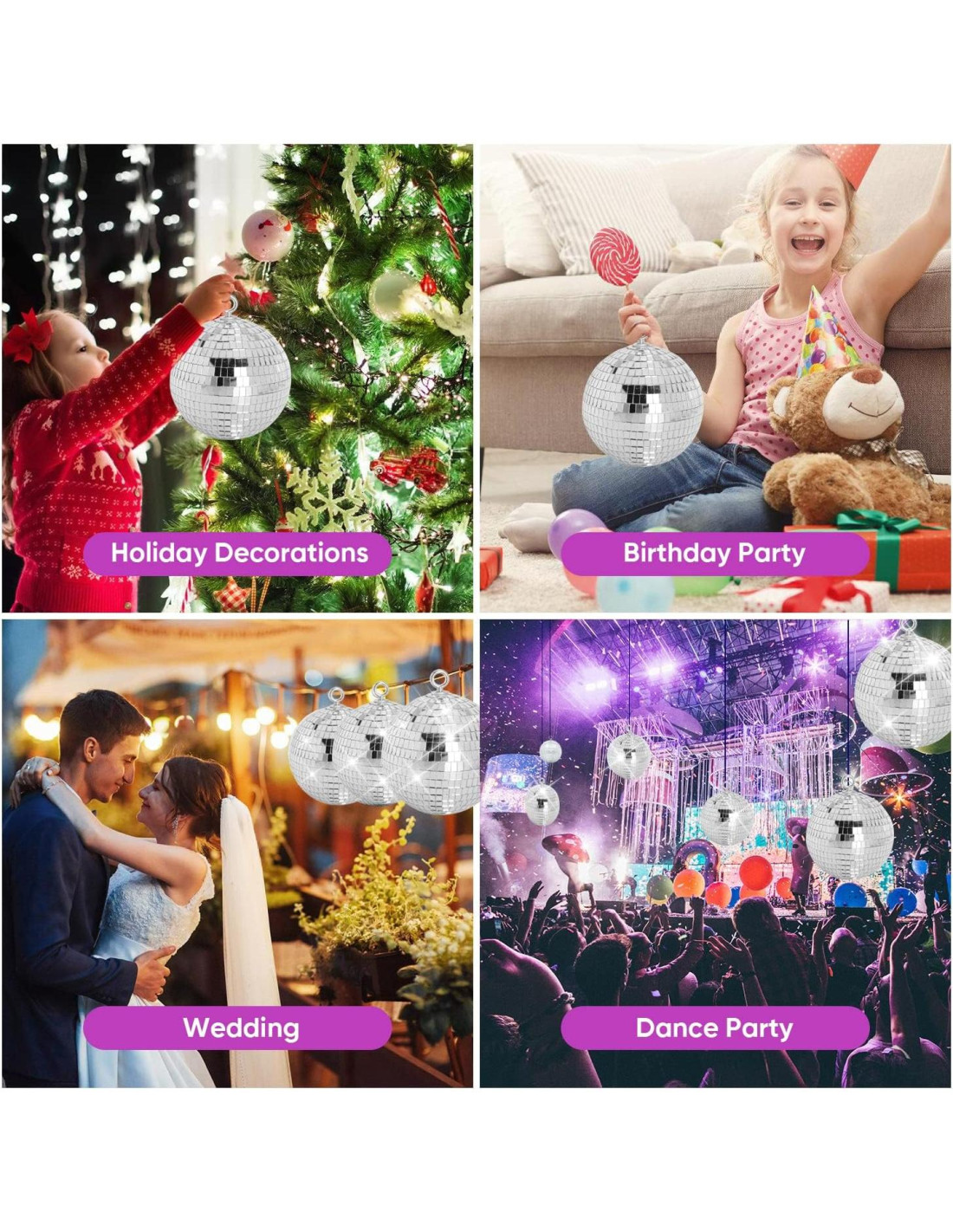 - Amplia Aplicación: esta bola de espejo disco se utiliza ampliamente para discos en casa y decoración de fiestas temáticas, fiesta de Halloween, Navidad nevada, bodas, cumpleaños, reuniones familiares, fiesta de Año Nuevo, KTV, escenario, actuaciones, etc.