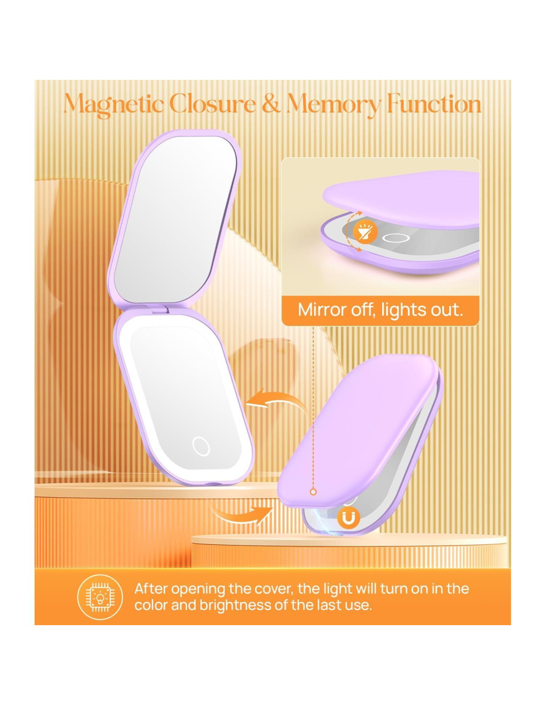 - Memoria de Brillo Cierra el espejo de viaje LED, el imán incorporado apagará automáticamente la luz y activará la memoria de color y brillo. Cuando vuelvas a abrir el espejo, podrás usar directamente el color y brillo de la luz que usaste la última vez