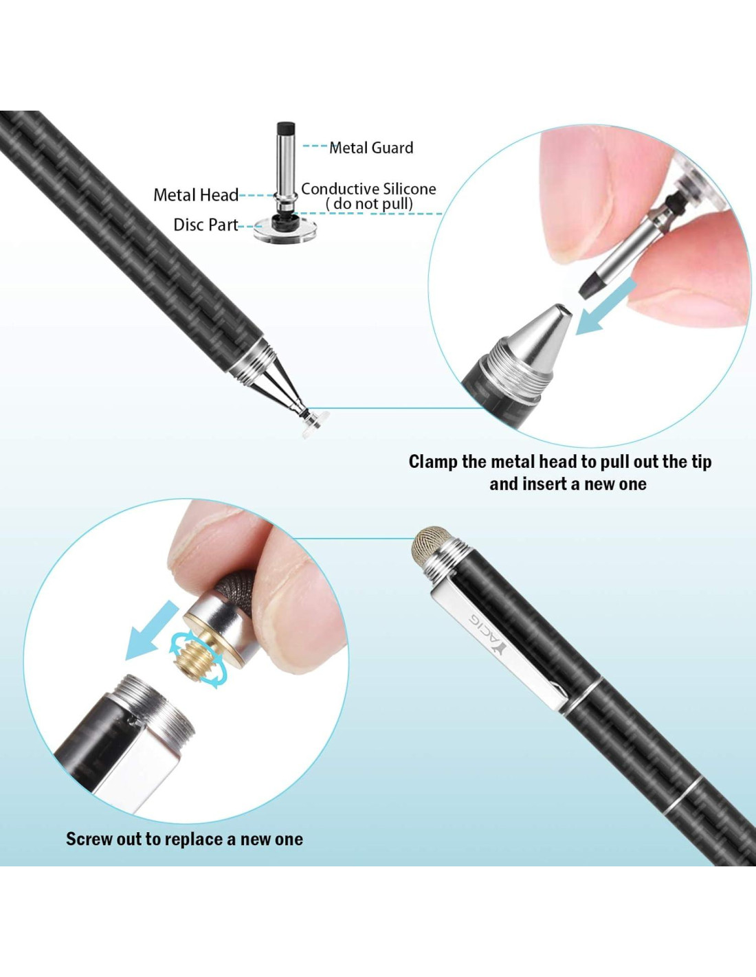 - [Diseño Práctico 4 en-1] --Incluye 4 puntas táctiles diferentes. 1 X 0.27" (6.86mm) Punta de Disco de Precisión; 1 X 0.27" (6.86mm) Punta de Fibra Reemplazable; Dos diámetros de punta de goma de diferentes tamaños: 0.2" (5mm) / 0.27" (6.86mm); Puedes elegir las diferentes puntas para diferentes propósitos. Además, este bolígrafo para pantalla táctil también puede usarse como un bolígrafo de bola regular. Puntas fácilmente intercambiables e incluso una punta de bolígrafo hacen de esto una maravillosa adición a tus implementos de escritura.