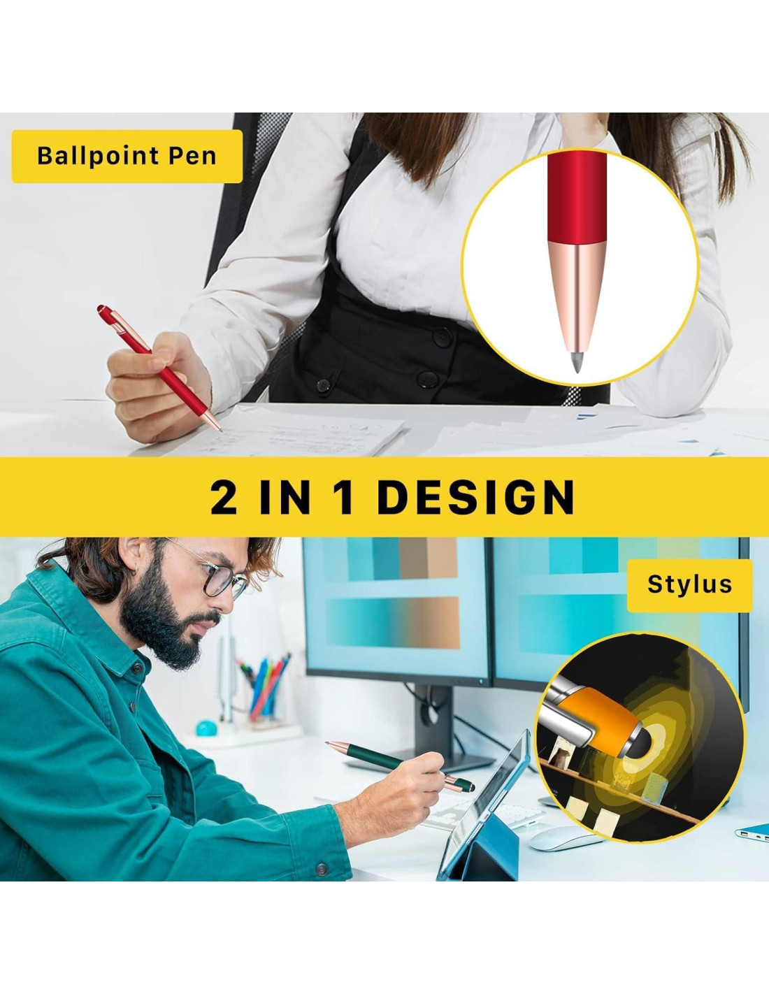 - Diseño 2-en-1: Un extremo tiene una punta de goma suave y duradera que se desliza fácilmente sobre la pantalla táctil. El otro extremo es un bolígrafo de tinta negra, que se puede extender presionando la parte superior del estilógrafo para una escritura suave, y el cartucho del bolígrafo es reemplazable.