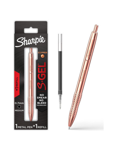 Para una experiencia de escritura que encarna sofisticación, no busques más que el bolígrafo Sharpie S-Gel Cobre. Este impresionante bolígrafo de gel suave viene con tinta negra audaz que siempre entrega una escritura vívida. El cuerpo de cobre premium no solo es visualmente impactante, sino que también le da al bolígrafo una sensación equilibrada y sofisticada al sostenerlo. Como todos los bolígrafos Sharpie S-Gel, esta edición cuenta con tecnología que no mancha, no borra, no sangra, dejando solo tu mejor trabajo atrás. Mientras tanto, la tinta especialmente formulada se desliza sin esfuerzo por la página. Refinado y recargable, este bolígrafo S-Gel incluso viene con una recarga de tinta adicional. ¡Descubre un bolígrafo más allá de las palabras con el Bolígrafo Sharpie S-Gel Cobre!