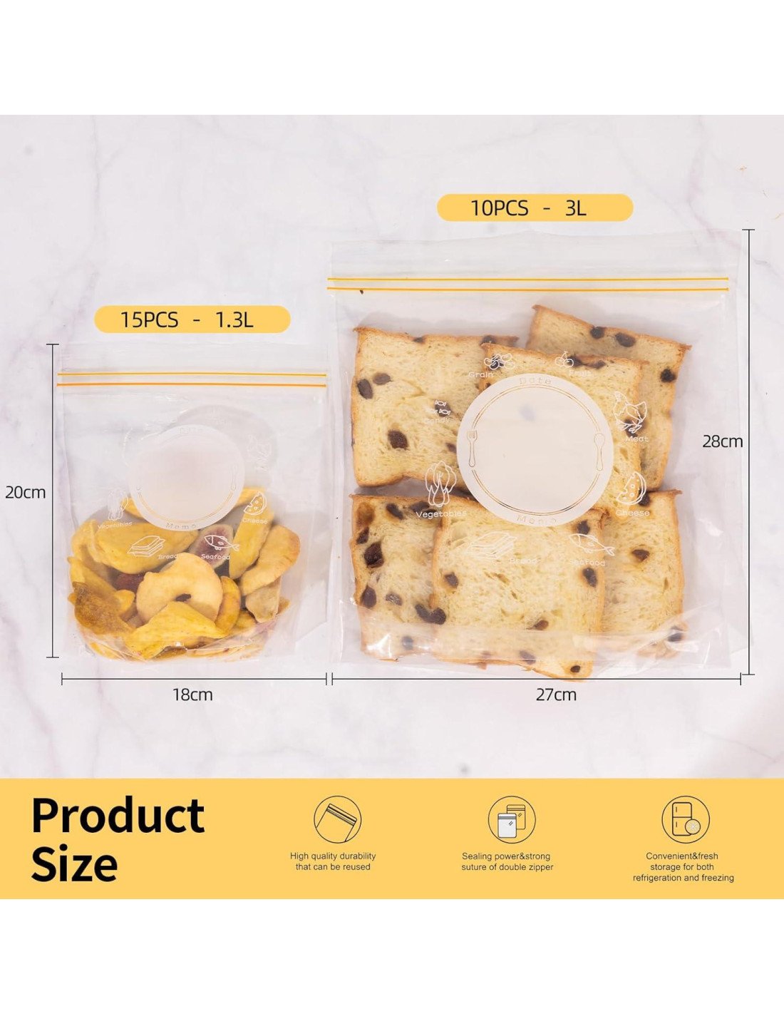 - CAPACIDAD: El conjunto incluye 15 bolsas de tamaño 1.3QT (18.0cm x 20.6cm x 3.6cm) y 10 bolsas de tamaño 3QT (27.1cm x 27.9cm x 4.1cm), totalizando 25 bolsas de almacenamiento
