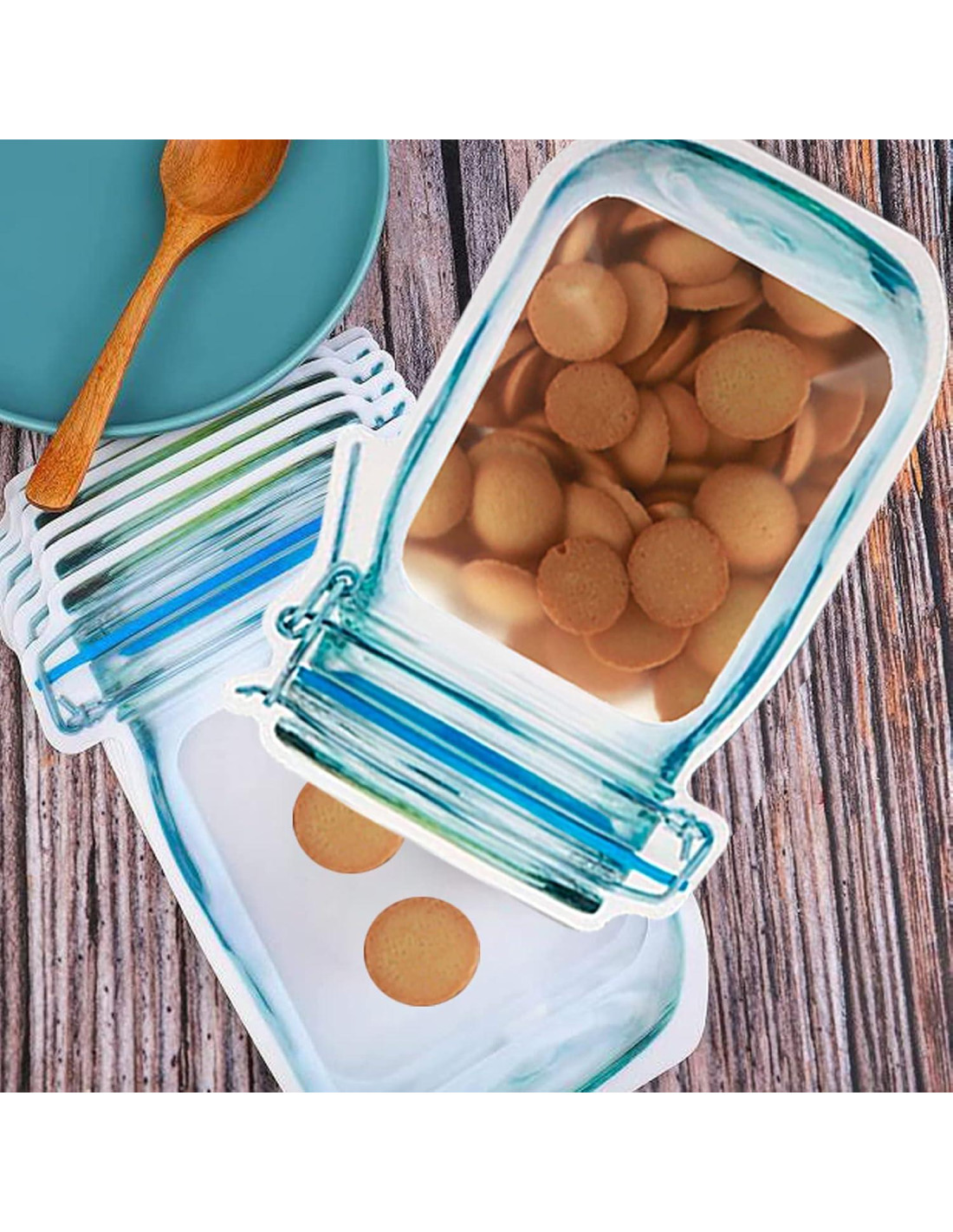 - Diseño de Cierre Hermético: Estas bolsas con forma de tarro de conserva están hechas de tiras de sellado de alta calidad, que pueden prevenir que el aire entre en la bolsa. Mantiene tu comida fresca durante horas, como galletas, frutas, verduras, especias, dulces.