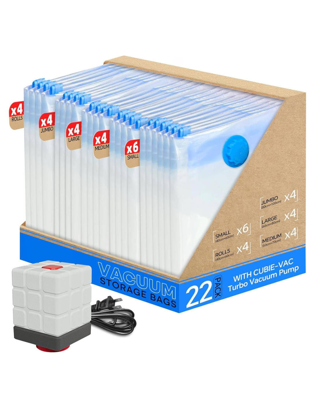 - Paquete de 22 Bolsas de Sellado al Vacío: Este versátil conjunto incluye 4 jumbo, 4 grande, 4 mediana, 6 pequeña y 4 bolsas de viaje enrollables, cubriendo todas tus necesidades de almacenamiento. Proporciona protección y organización exquisita para tu ropa diaria, atuendos de temporada, etc.