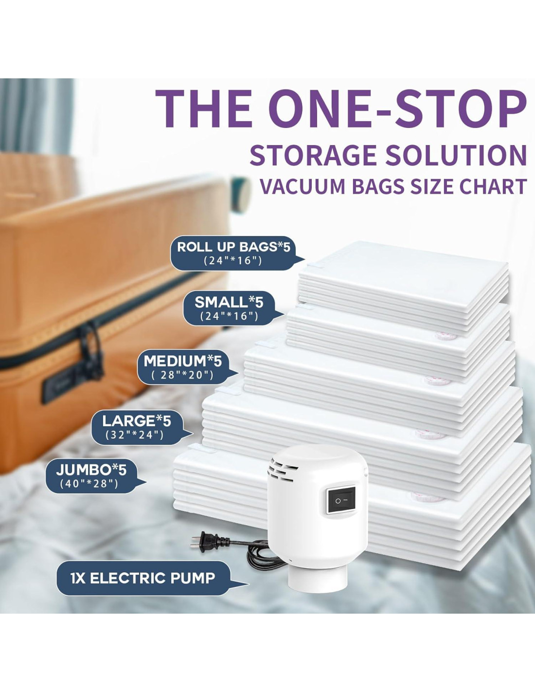 - 25 Bolsas de Almacenamiento al Vacío & Bomba de Aire Eléctrica 25 bolsas de almacenamiento al vacío en 5 tamaños (Jumbo, Grande, Mediana, Pequeña y Mano Roll Up) Nuestras bolsas de sellado al vacío para ropa de viaje están equipadas con una bomba de almacenamiento al vacío eléctrica de alto rendimiento. Solo conecta la energía y presiona el interruptor en la parte superior, y observa cómo expulsa rápidamente el aire. Es fácil y ahorra tiempo. Puedes usar tus manos para presionar las bolsas y hacer que el aire salga de las bolsas. 25 bolsas ahorradoras de espacio satisfacen las necesidades de almacenamiento diarias o sirven como bolsas de mudanza