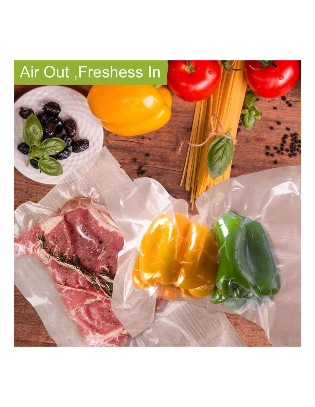 Bolsas de sellado al vacío para almacenamiento de alimentos VacYaYa con superficie de alta resistencia y textura, creando canales para que el aire sea fácilmente removido de la bolsa. Los rollos de bolsas de sellado de alimentos, como resultado de su diseño texturizado, protegerán tus alimentos de las quemaduras por congelación y prolongarán su vida útil durante el almacenamiento. Además, dado que puedes personalizar el tamaño de la bolsa, hay menos desperdicio. Siempre tienes el tamaño adecuado para satisfacer tus necesidades. Las bolsas de vacío para alimentos bloquean el oxígeno y la humedad. Los canales de eliminación de aire texturizados aumentan la succión para una frescura máxima. Más de 5 veces más tiempo de almacenamiento en el congelador, manteniendo la frescura, el sabor y el valor nutricional - ¡sin quemaduras por congelación!