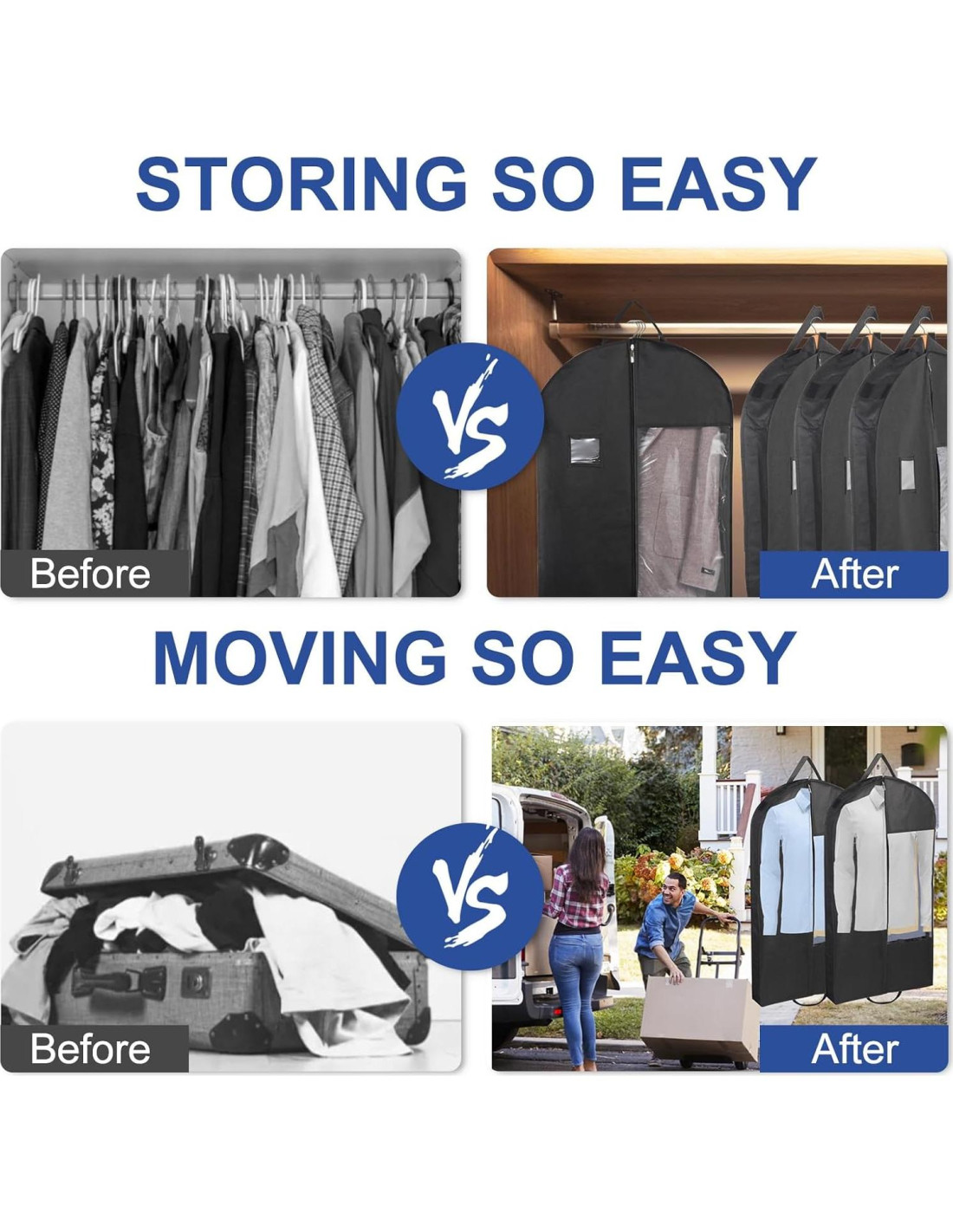 - [Tela de calidad] : Bolsa de traje negra para almacenar trajes y guardarropas. Hecha de material no tejido ligero y transpirable. Mientras lo cuides, durará y promete proteger tu ropa en todo momento. Las bolsas de ropa son ligeras y duraderas.