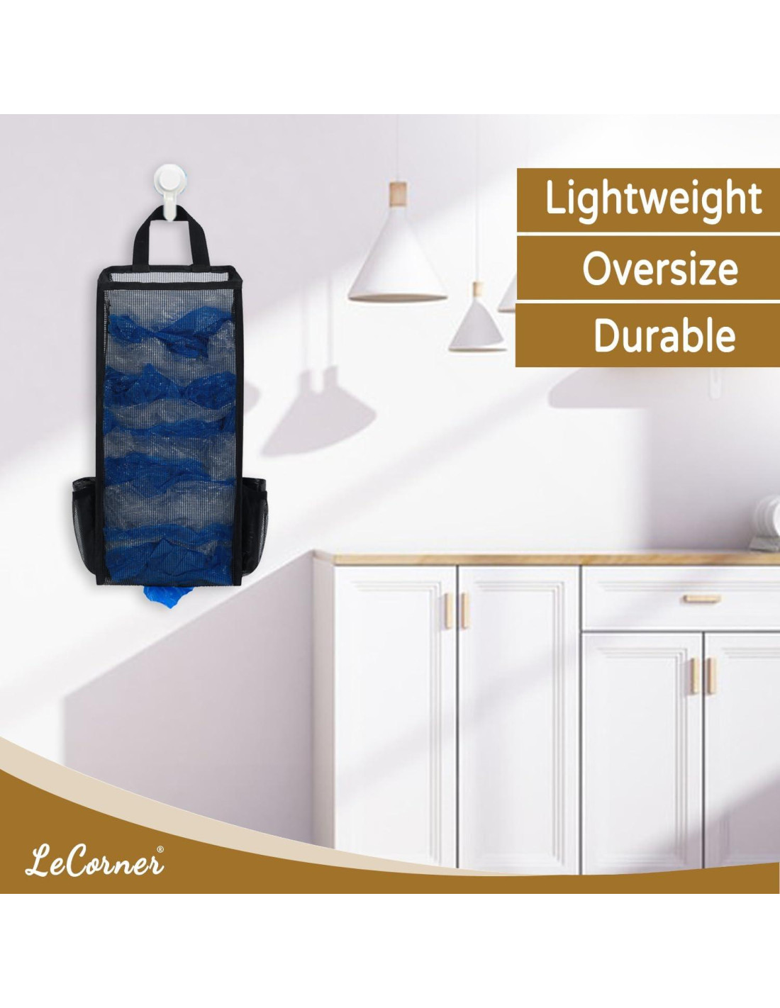 - Diseño Único y Conveniente - Nuestros soportes para bolsas de plástico para bolsas de compras están hechos de malla de plástico transpirable y material de poliéster que es resistente y lavable. El organizador de bolsas de plástico ligero tiene un diseño único, hay dos bolsillos laterales que pueden almacenar dos rollos o un gran rollo de bolsas de basura. Nuestro soporte para bolsas de basura es fácil de usar, puedes ponerlo por la parte superior y sacarlo por la parte inferior. Con un diseño colgante, el soporte para bolsas de compras de LeCorner para bolsas de plástico es fácil de instalar.