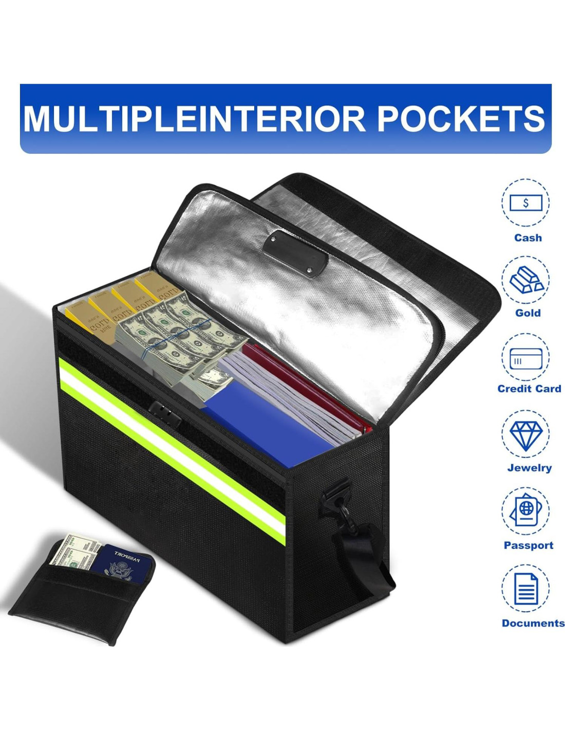- [Fácil de llevar y gran capacidad] Esta bolsa de documentos resistente al fuego es adecuada para almacenar objetos de valor como carpetas A4, tabletas, diplomas, títulos y licencias nacionales. Su silicona resistente al fuego también puede proteger a los usuarios de alergias a la fibra de vidrio, haciéndolo más cómodo y seguro. El diseño de la correa de transporte y hombro no solo permite que la coloque en casa, oficina, automóvil, caja fuerte, casillero, sino que también reemplaza las cajas fuertes voluminosas y la lleva consigo al viajar. Por supuesto, también es un gran regalo para su familia.