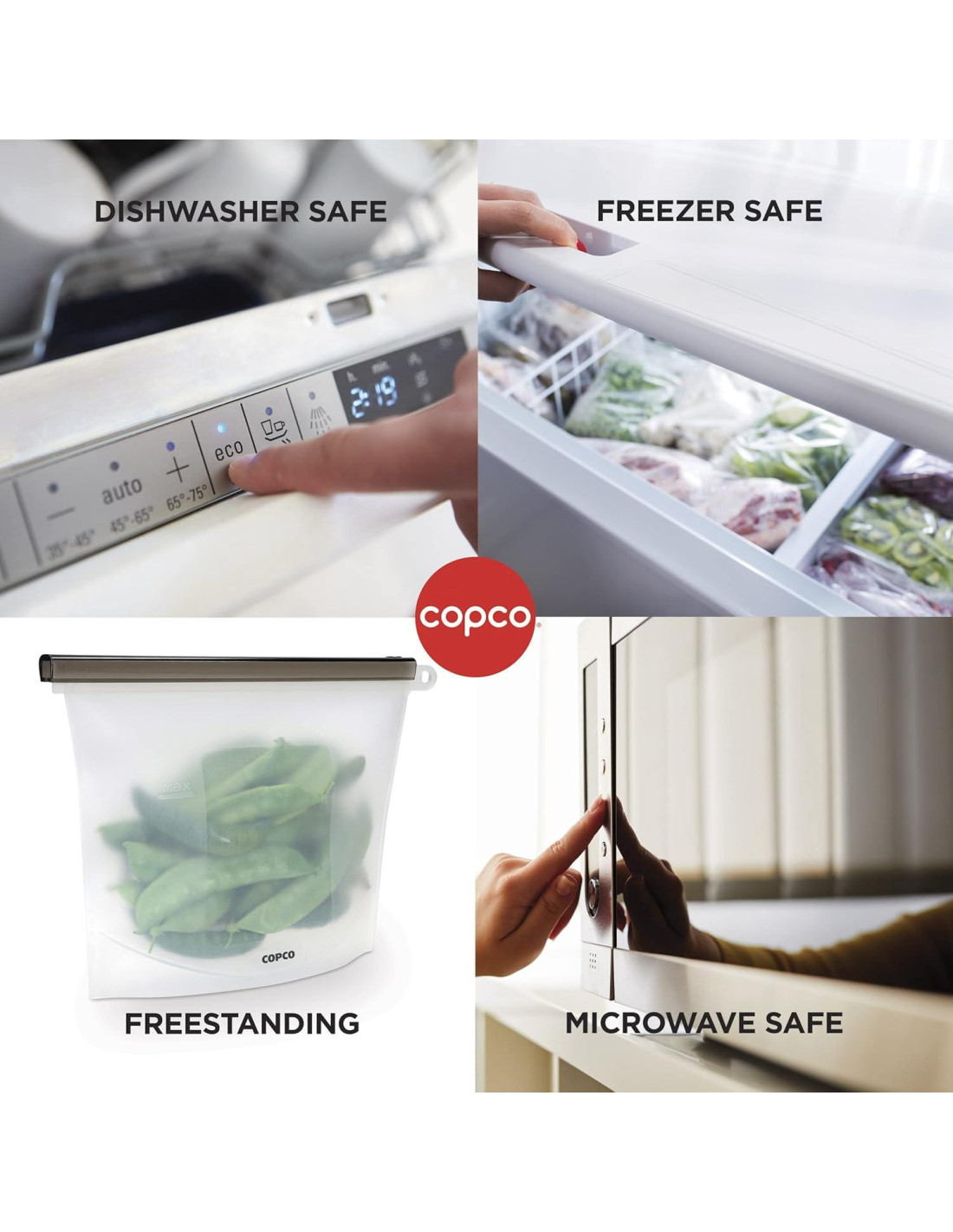 La Bolsa Grande Reutilizable de Silicona Copco es perfecta para almacenar y recalentar sobras, congelar frutas y verduras para la preparación de comidas, y empacar alimentos para almuerzos. Esta bolsa versátil también es ideal para organizar artículos de cuidado personal, suministros de arte u oficina, y más. El cierre deslizante asegura la bolsa para mantener los alimentos frescos y prevenir derrames. La bolsa se mantiene erguida cuando está llena para ahorrar espacio. La construcción de silicona reutilizable y segura para alimentos soporta un uso frecuente y ayuda a reducir los desechos plásticos. Cuenta con un lazo para colgar en armarios o closets. El diseño transparente permite ver el contenido en su interior; la bolsa es marcable y borrable para una fácil etiquetación y acceso rápido a los artículos. Apta para congelador, microondas y lavavajillas en la parte superior. Retire la barra de sellado de plástico y mantenga la bolsa abierta en el microondas. Limpie inmediatamente después de usar para evitar manchas. Capacidad de hasta 1,500 ml.