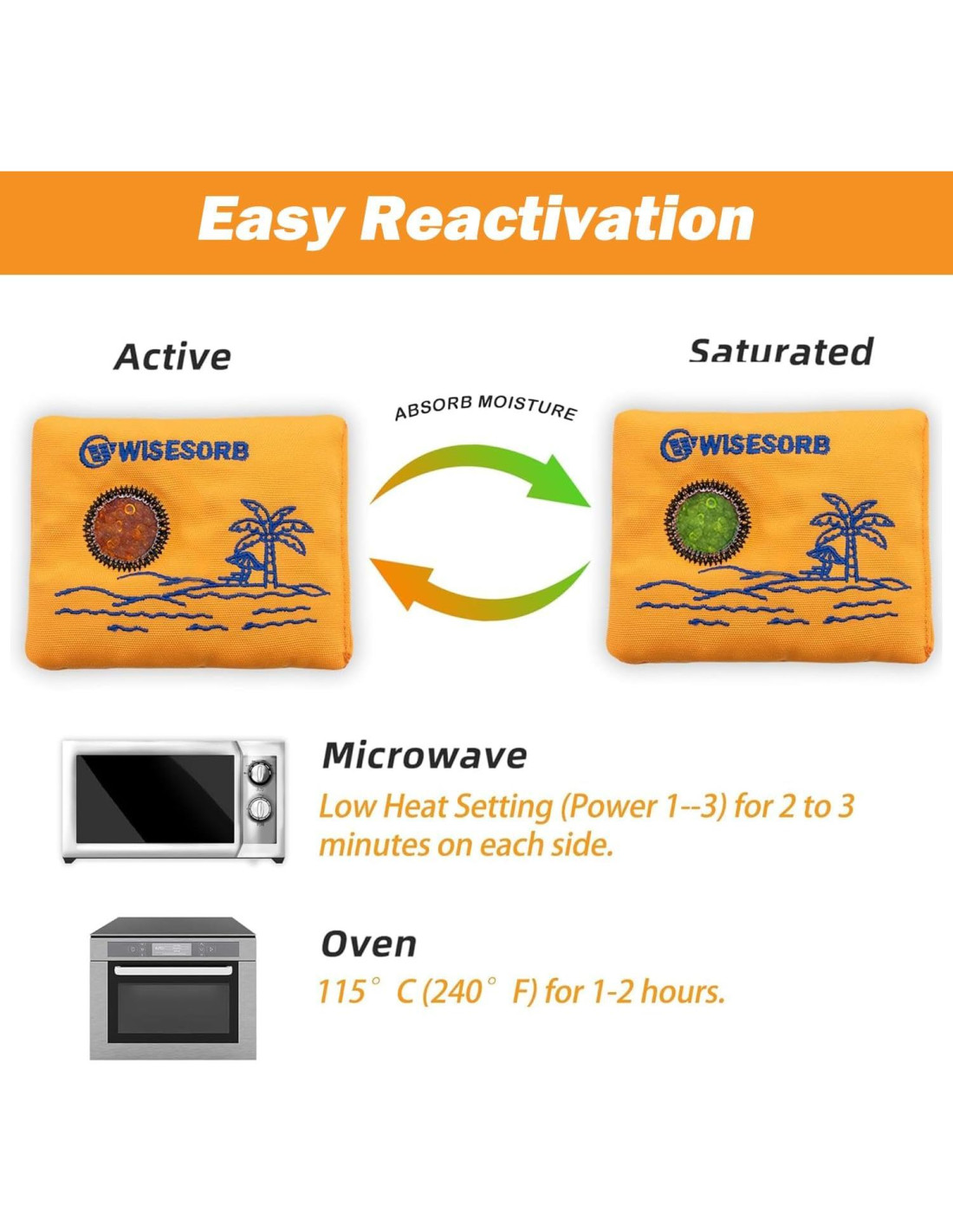 - [Reactivación Fácil en Microondas y Horno] Reactivar los absorbentes de humedad es rápido y simple. En el microondas, puedes eliminar la humedad acumulada calentando durante hasta 2 minutos por cada lado. Nota: Usa niveles de potencia de microondas 1-3 para calor bajo y evitar derretir la ventana transparente. Alternativamente, para la reactivación en horno, coloca el deshidratante de gel de sílice reutilizable en el horno durante 1 a 2 horas a 200F (93C) a 250F (121C) (evita exceder 250F).