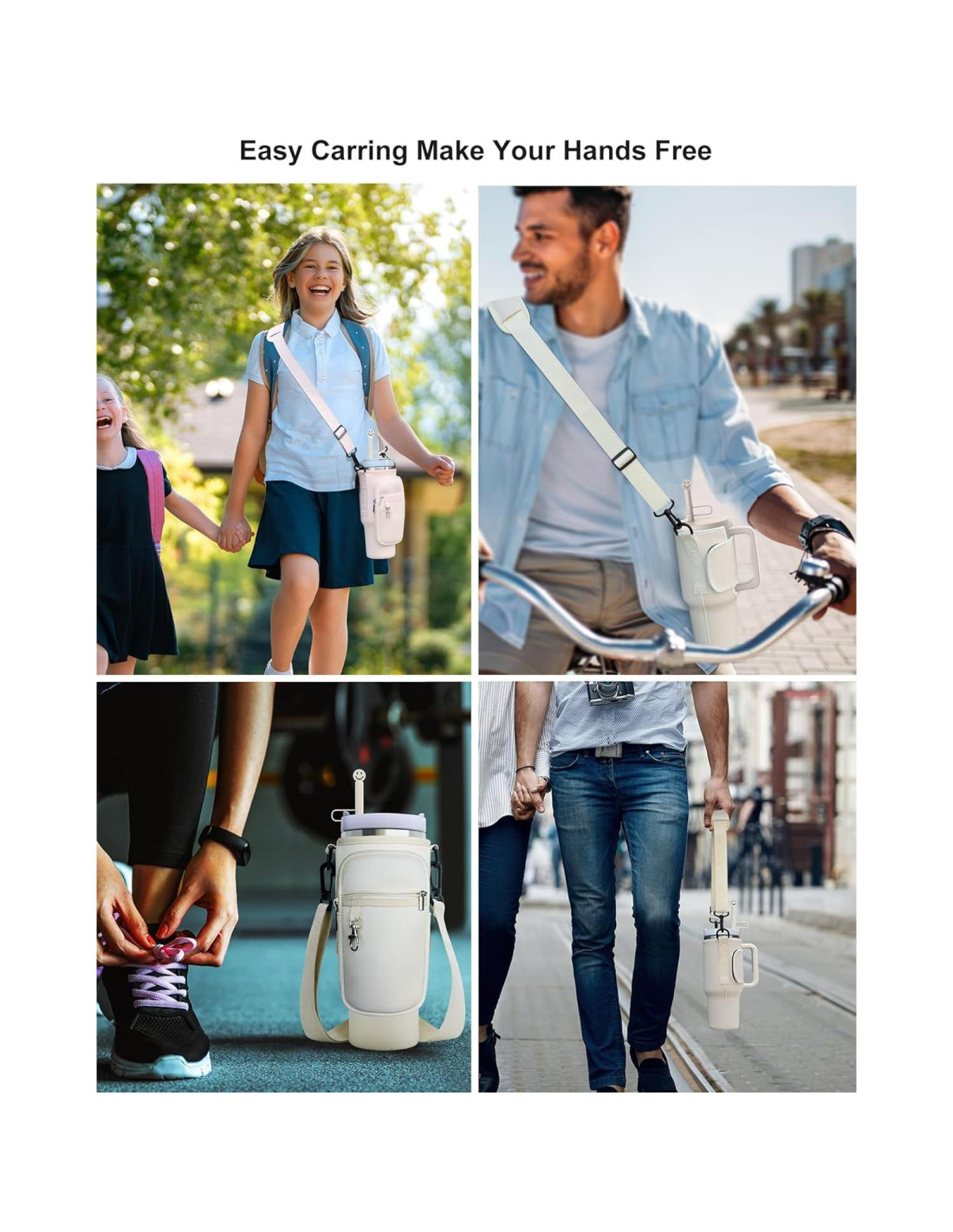 - Correa Ajustable. Bolsillos Convenientes. La funda para taza de 40 oz viene con una correa de hombro removible y ajustable que es suave y acolchada, permitiendo un fácil ajuste entre 69.85 cm y 127 cm para adaptarse a la mayoría de los tamaños de cuerpo. Dos diseños de bolsillo frontal que ofrecen mucho espacio para todas tus pertenencias personales como teléfonos inteligentes, efectivo, tarjetas, llaves, etc.
