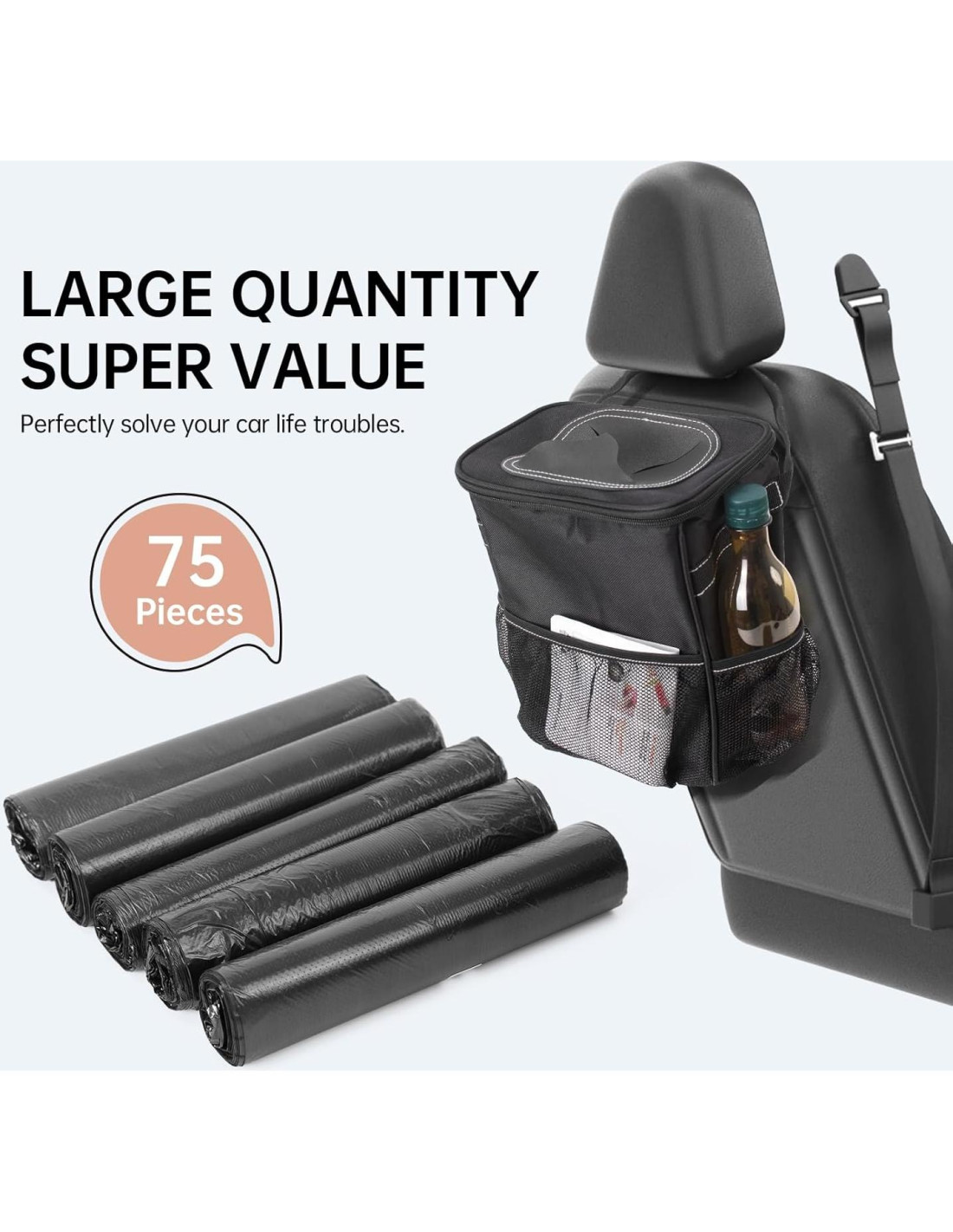 - Ajuste Perfecto: Estas bolsas de basura para auto están diseñadas para encajar sin problemas en cualquier auto, haciendo que la gestión de residuos sea fácil y accesible con bolsa de basura para auto.