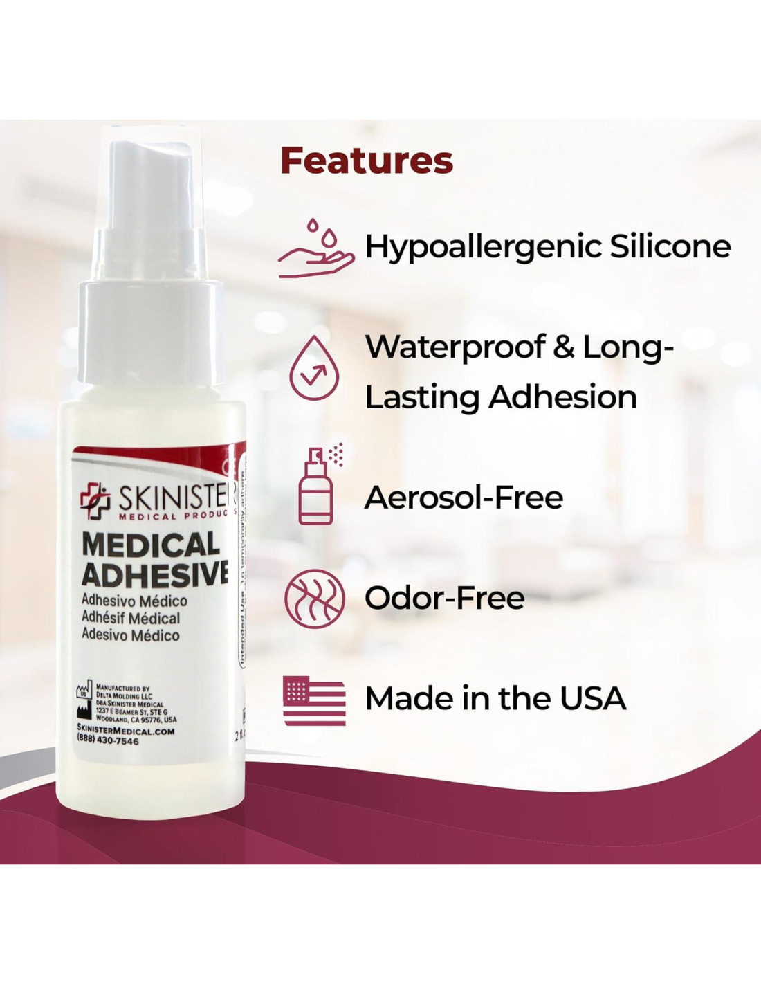 El spray adhesivo médico Skinister ofrece una adhesión duradera, un tiempo de uso prolongado y prevención de fugas para dispositivos médicos como bolsas de ostomía, formas de pecho de silicona y catéteres de condón. Este pegamento para piel de grado médico es hipoalergénico, suave con la piel sensible y resistente al agua. Disfruta de un agarre seguro mientras te bañas, nadas o haces ejercicio. Combínalo con el removedor de adhesivo médico Skinister para una fácil eliminación sin escozor.