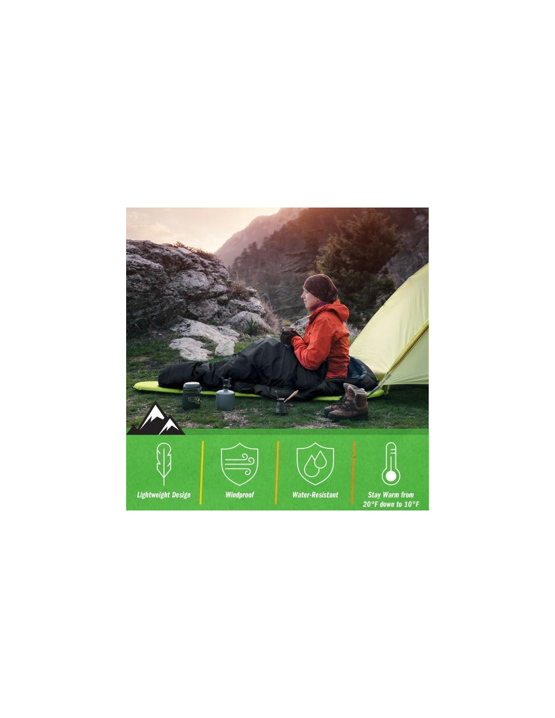 - DETALLES DEL PRODUCTO - Materiales: Poliéster 210T y Algodón PP. Dimensiones: (L) 83" (aproximadamente 210.8 cm) x (W) 28" (aproximadamente 71.1 cm) x (H) 3.5" (aproximadamente 8.9 cm); Enrollado: (L) 17" (aproximadamente 43.2 cm) x (W) 8" (aproximadamente 20.3 cm); 2.98 lbs (aproximadamente 1.35 kg). Calificación de temperatura: 10 - 20F (aproximadamente -12.2 a -6.7C). Resistente al agua: 8000g/(m*24h). A prueba de viento: 2500g/(m*24h). Transpirable: 140mm/s. Color: Negro.