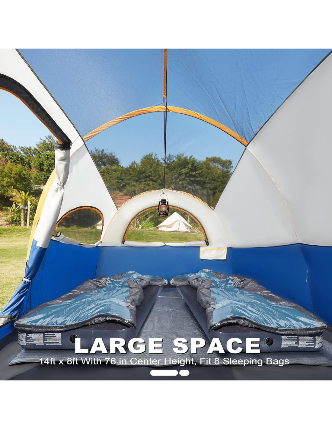 - [ Espaciosa para Tienda Familiar de 8 Personas ] : Las tiendas para camping son adecuadas para familias de 8 miembros. Con dimensiones de 169(L) x 95(W) x 76(H) pulgadas (429,3 cm x 241,3 cm x 193 cm). Es adecuada para 3 colchones de aire tamaño queen o 8 sacos de dormir. Es una opción ideal para familias que disfrutan pasar tiempo de calidad juntas al aire libre