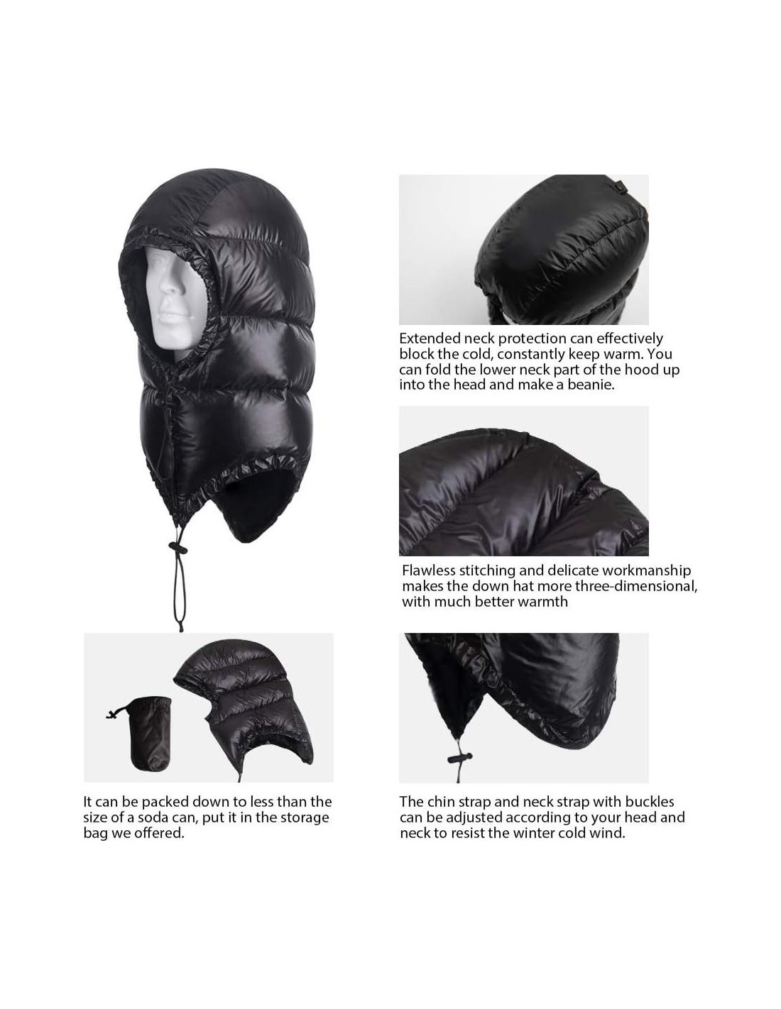 - Amplia practicidad: Este gorro de plumas es perfecto para todas las estaciones para acampar, escalar, cazar, pescar en hielo, esquiar, hacer senderismo, viajar y también protege bien tu cuello. Puedes usar esta capucha con un saco de dormir en clima frío para que te sientas cómodo y cálido toda la noche y tengas un buen sueño.