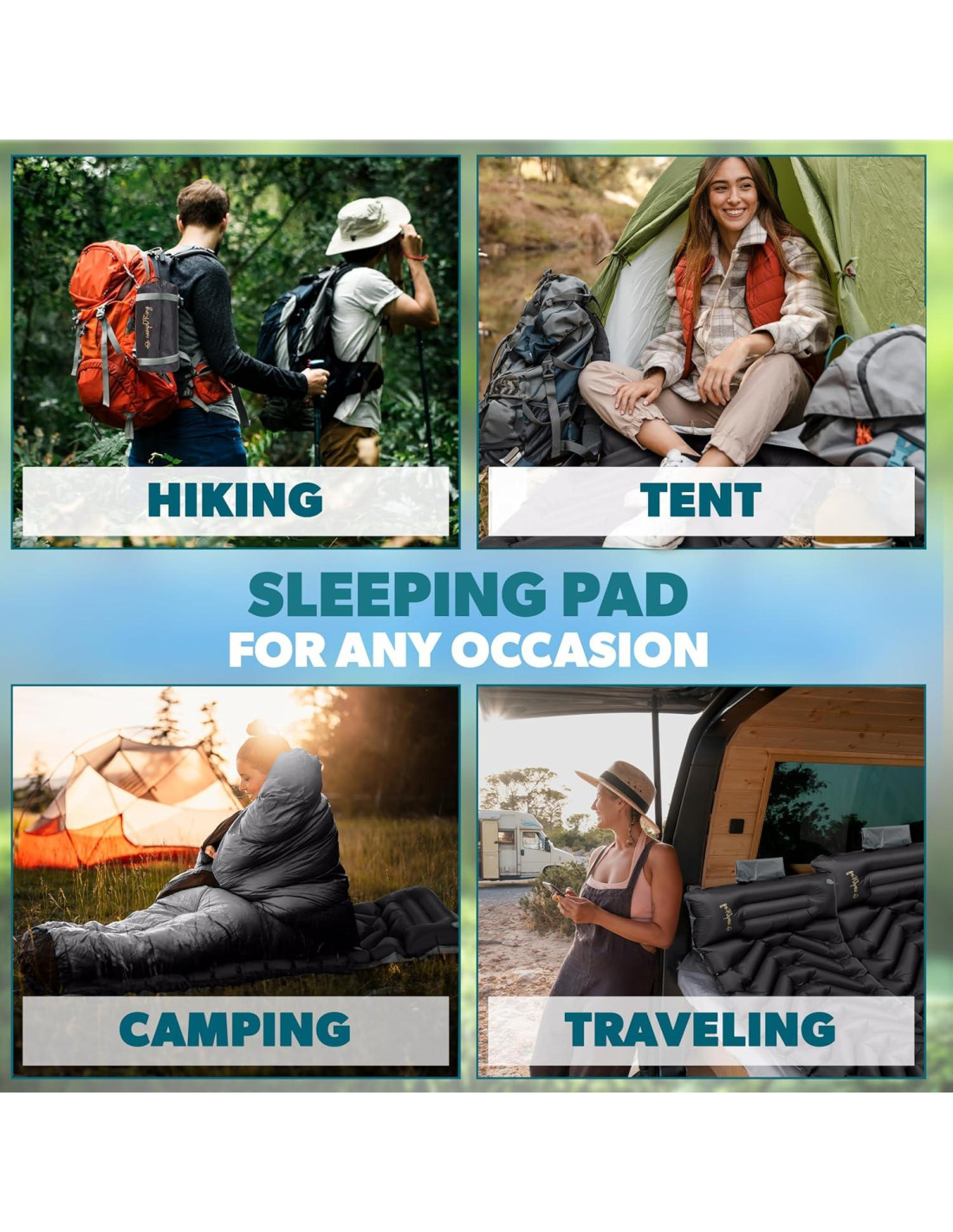 - [Inflado con el pie - Solo se necesita 1 min] Colchoneta de dormir para acampar con inflado por pie mejorada. No es necesario inflar con las manos, la boca o una bomba para nuestra colchoneta de dormir autoinflable. Solo toma 1 min después de inflar completamente la colchoneta de dormir pisando el lugar de la bomba incorporada con el pie. Menos de 1 min para desinflar.