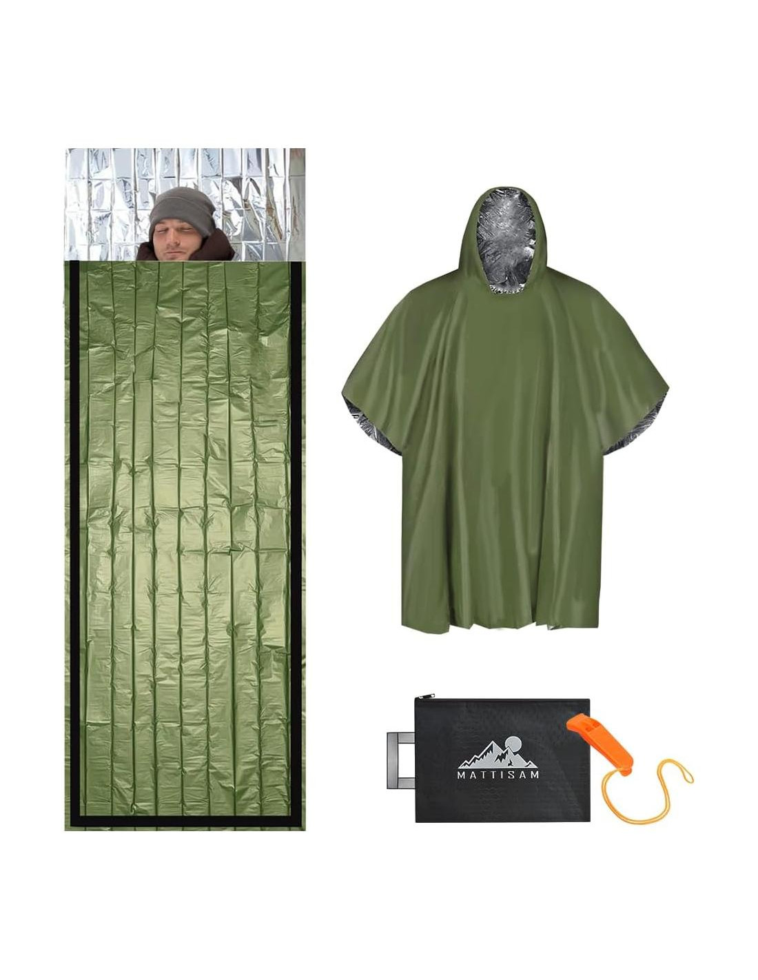 - Componentes incluidos: 1 saco de dormir de emergencia, 1 poncho de lluvia, 1 silbato