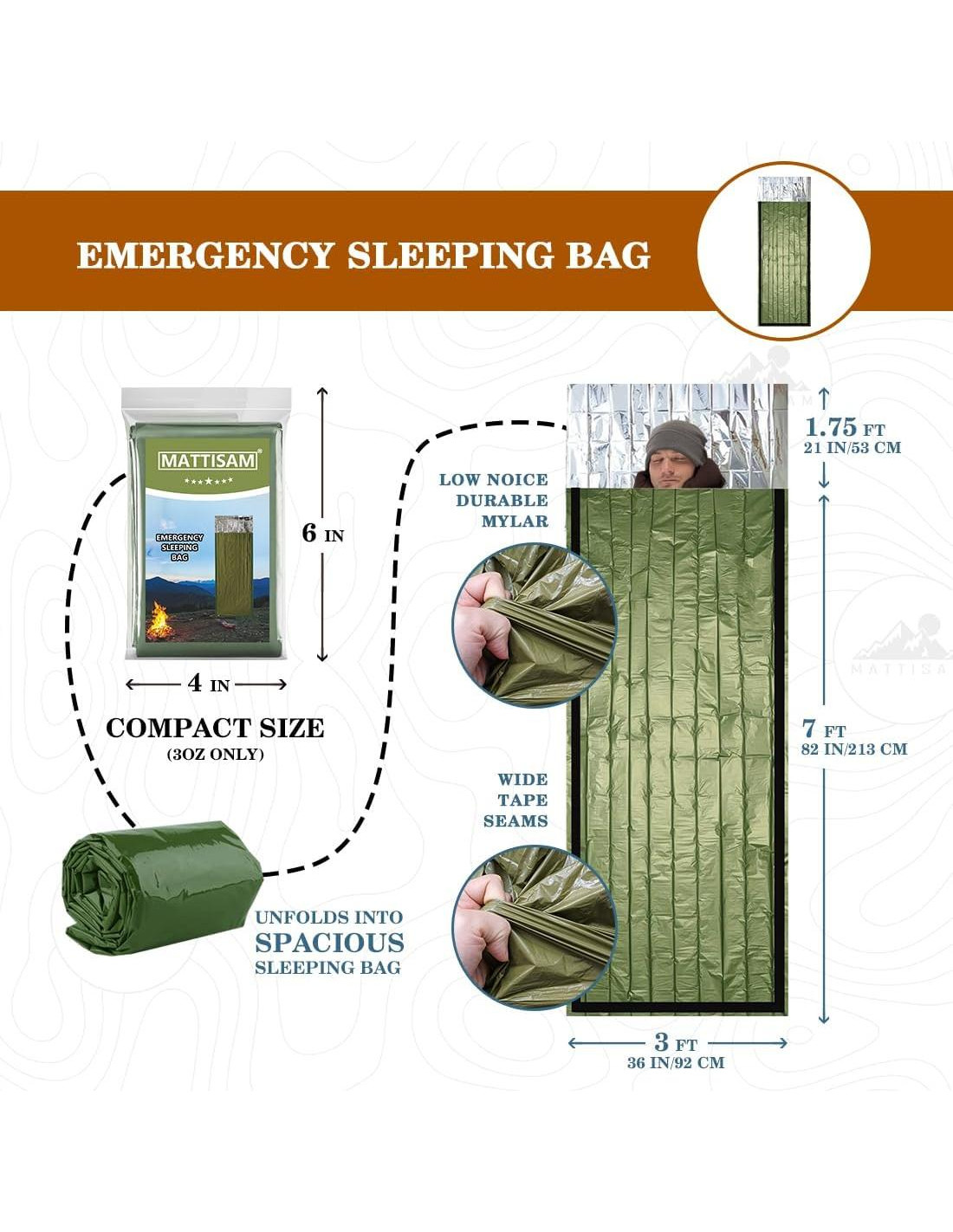 Contenido del paquete: 1 saco de dormir de emergencia con capucha y 1 poncho de lluvia de emergencia y silbato de supervivencia