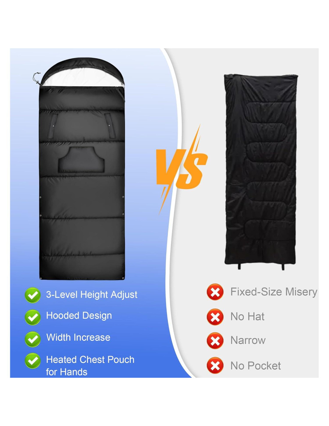 - Diseño de sudadera portátil con agujeros para brazos: ¡Este no es solo un saco de dormir, es una sudadera portátil versátil! Los agujeros para brazos estratégicamente colocados te permiten alcanzar fácilmente objetos, leer un libro, jugar en tu teléfono o disfrutar de una bebida caliente sin dejar que el aire frío entre. Resuelve el problema común de los campistas de congelarse al alcanzar algo por la noche. Además, el conveniente bolsillo en el pecho proporciona un lugar cálido para mantener el calor de las manos o almacenar de manera segura pequeños elementos esenciales como tu teléfono o linterna.