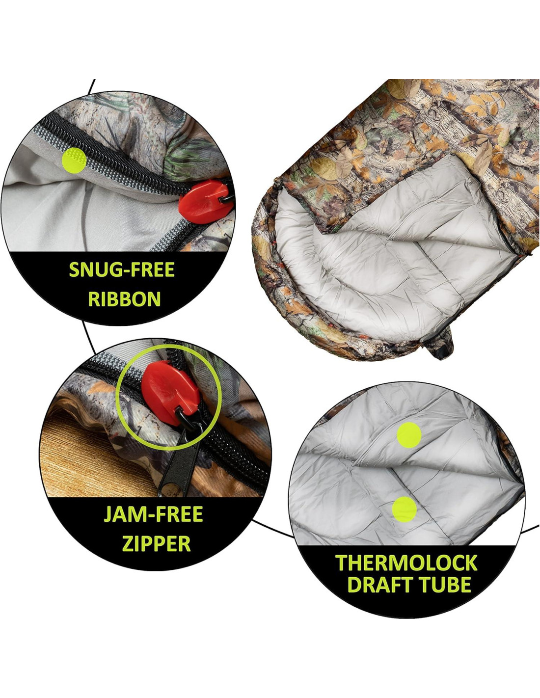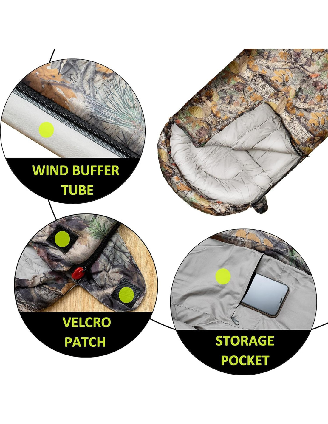- Característica especial: forma de sobre con capucha; fácilmente abierto para usar como manta, patrón único de camuflaje forestal, cremallera sin atascos; buffer de viento