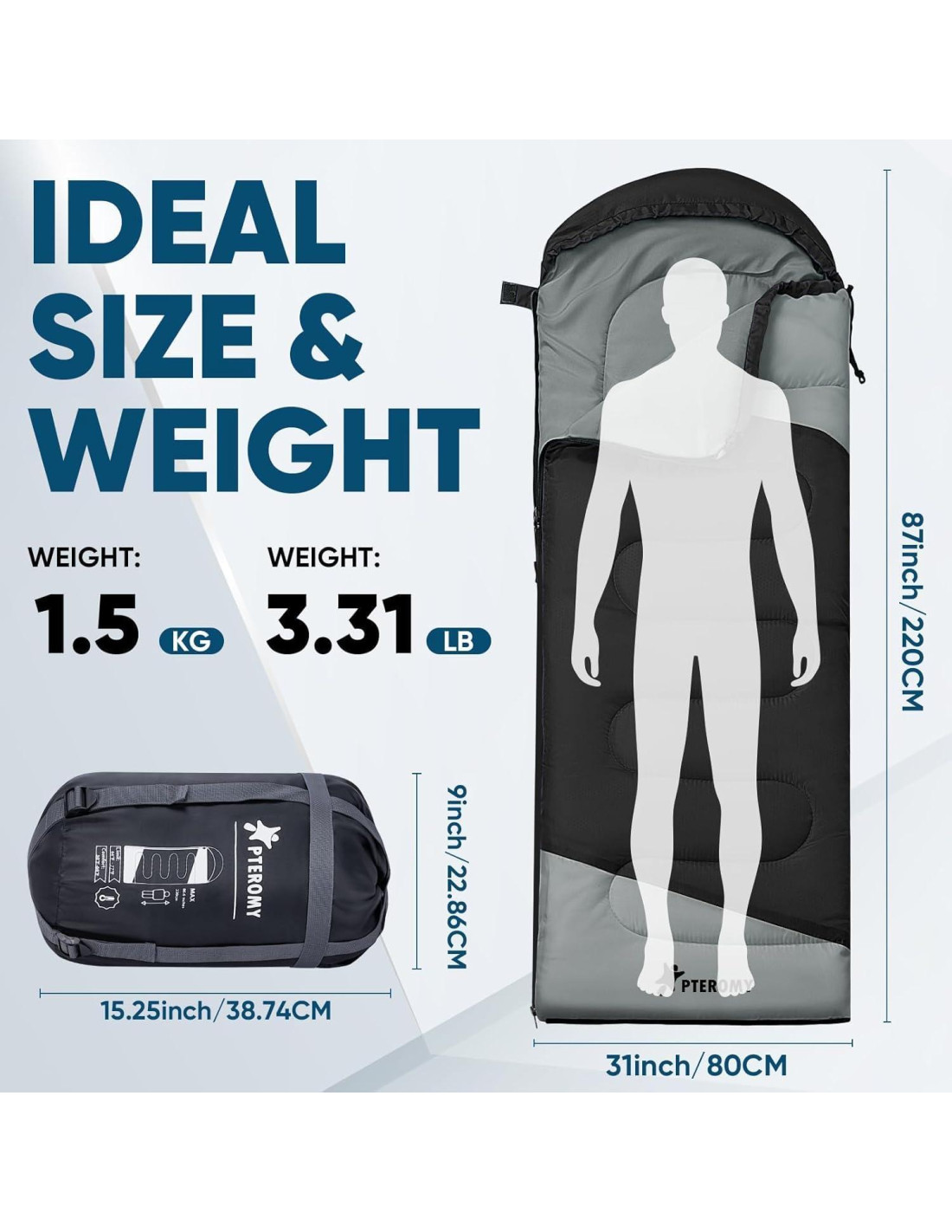 - Cómodo: Diseñado para un rango de temperatura de confort de 50-68 grados Fahrenheit (10-20 grados Celsius) y un límite recomendado de 44-77 grados Fahrenheit (6-25 grados Celsius), este saco de dormir para adultos mide 7 pies 2 pulgadas (220 cm) de largo y 2 pies 7.5 pulgadas (80 cm) de ancho, acomodando cómodamente a adultos de hasta 6-7 pies de altura.