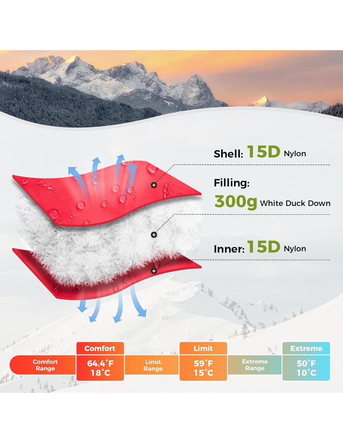 - SACO DE DORMIR DE PLUMAS: Con nylon ripstop ultraligero de 15D (más delgado pero más resistente que el estándar 20D), este saco de dormir ultraligero está emparejado con 300g de plumón de pato blanco con un poder de relleno de 650+ - mantiene el calor de 10C a 18C para acampar y hacer senderismo en 3 estaciones. Golpea el saco de dormir antes del primer uso para que el plumón sea más esponjoso