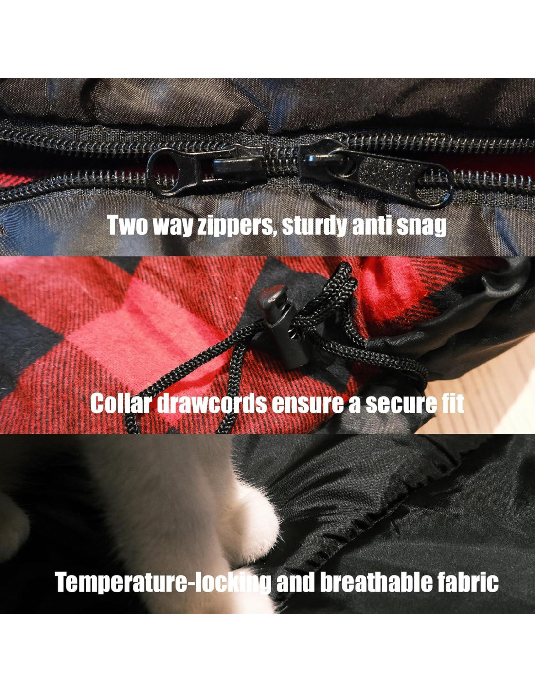 - Dos cremalleras bidireccionales con deslizadores antideslizantes, y un tirador de cuello altamente elástico para evitar que el calor se escape del cuello, o desabrochar desde la parte inferior y sacar los pies para regular el calor si sientes que te estás calentando demasiado. (costura de cremallera bidireccional izquierda y derecha para unir los dos sacos de dormir juntos para dos personas)