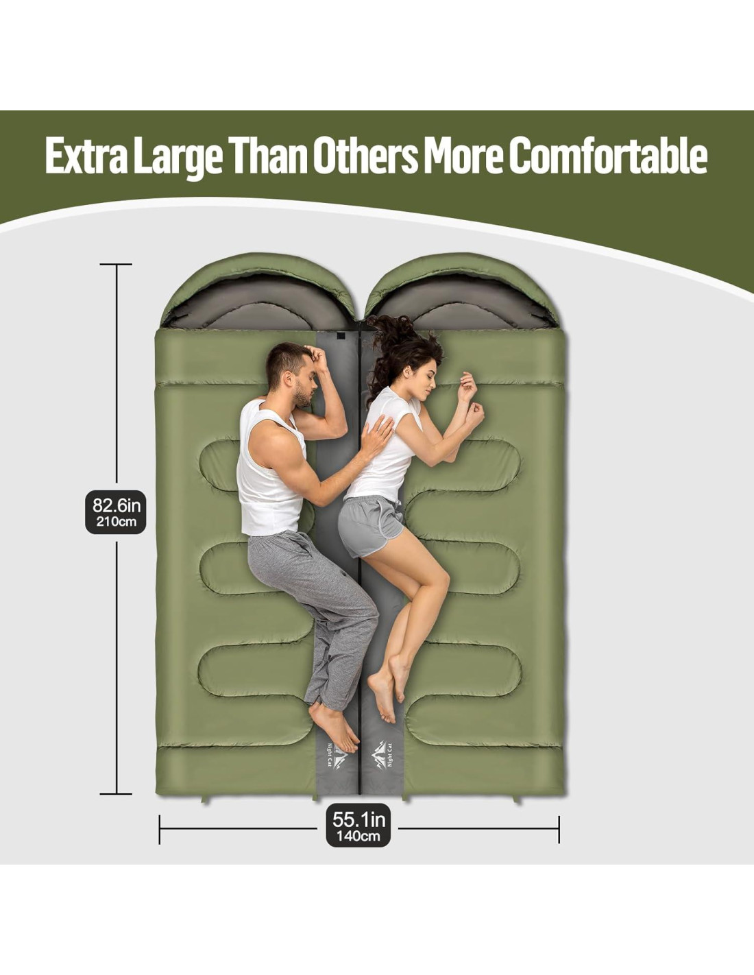- [Cálido y cómodo] Estos sacos de dormir para clima frío para dos adultos son perfectos para condiciones climáticas frías, ideales para mochileo, camping o senderismo. Los sacos de dormir de doble capa con costuras en forma de S evitan que el relleno se desplace. Cuando tu piel lo toca, es muy suave como abrazar un peluche, lo que te hace dormir más fácilmente.