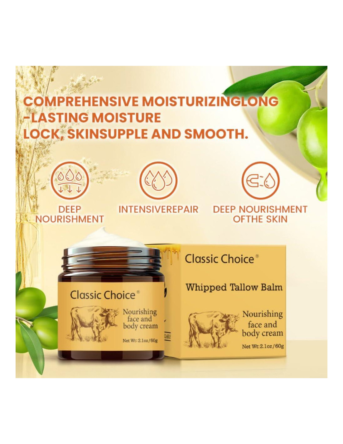 Descubre el poder nutritivo del Bálsamo de sebo batido de Classic Choice, una lujosa crema para cara y cuerpo que combina ingredientes probados a lo largo del tiempo para un cuidado integral de la piel. Este tarro de 59.4 g presenta una mezcla única de ingredientes naturales, incluyendo sebo que repone lípidos esenciales y mantiene la piel suave, junto con aceite de oliva que mejora la textura de la piel y promueve la elasticidad. La fórmula está enriquecida con extracto de caléndula, extracto de rosa y miel para beneficios de hidratación profunda. La consistencia batida crea una crema suave y de rápida absorción que proporciona un bloqueo de humedad duradero y ayuda a mantener la piel flexible. Perfecto para uso diario, este bálsamo ofrece reparación intensiva y nutrición profunda tanto para la cara como para el cuerpo. Los ingredientes cuidadosamente seleccionados trabajan juntos para proporcionar beneficios de hidratación integral mientras ayudan a mantener el equilibrio natural de la piel. Experimenta la diferencia con este enfoque tradicional y moderno del cuidado de la piel que se centra en la nutrición profunda y la hidratación duradera.
