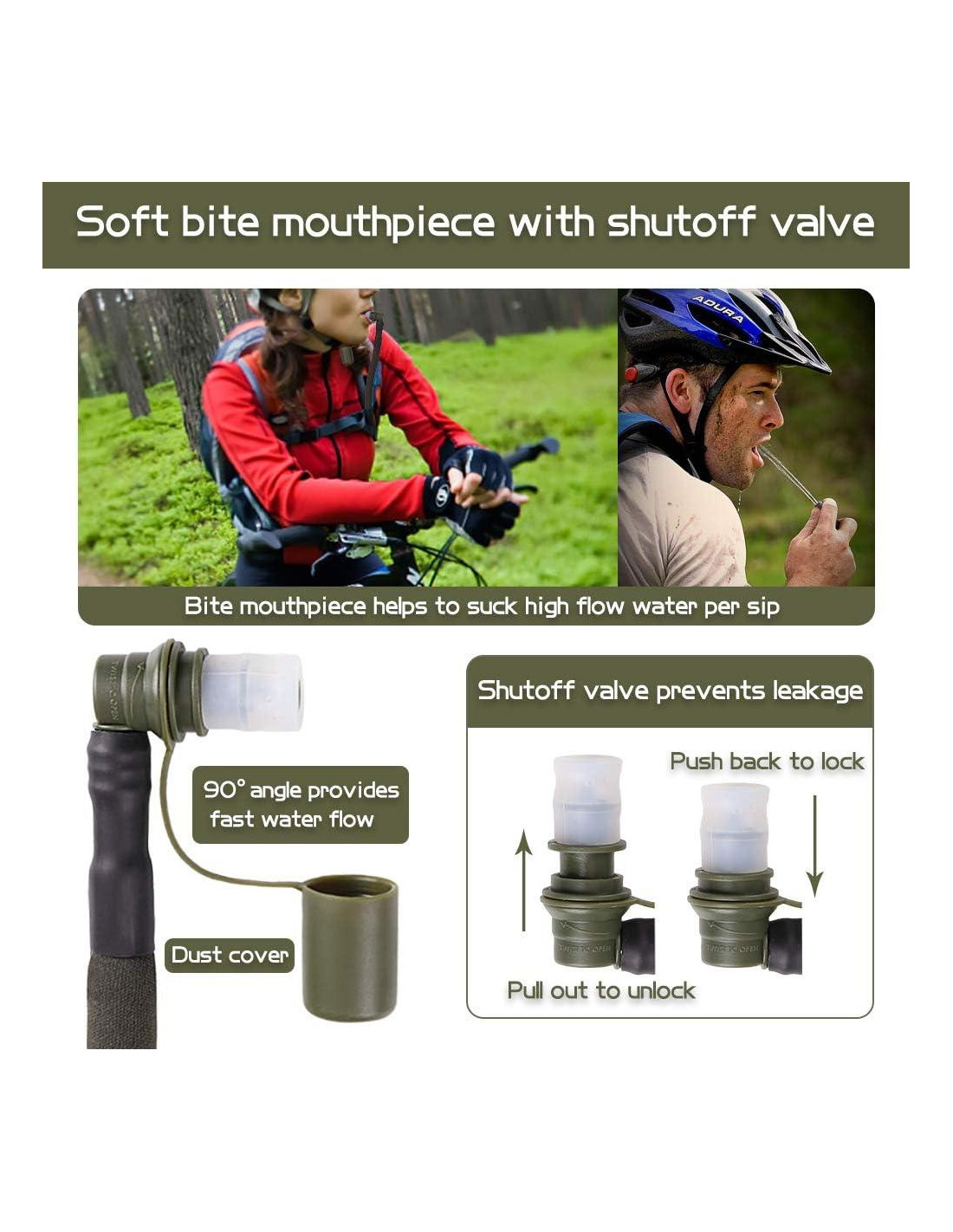 - [VÁLVULA DE MORDIDA INNOVADORA, AGUA DE ALTO FLUJO] El saco de hidratación con válvula de mordida en ángulo de 90 te ayuda a beber rápidamente mucha agua por sorbo. Solo necesitas doblar el tubo con un ángulo menor para llevar la boquilla a tu boca. Un ángulo de doblado menor hace que el flujo de agua sea más efectivo. La válvula de mordida está diseñada para empujar/tirar, lo que te permite cerrar el flujo cuando no la usas y tirar fácilmente con los dientes para reiniciar el flujo. Una tapa mantiene la boquilla del reservorio de agua limpia al aire libre