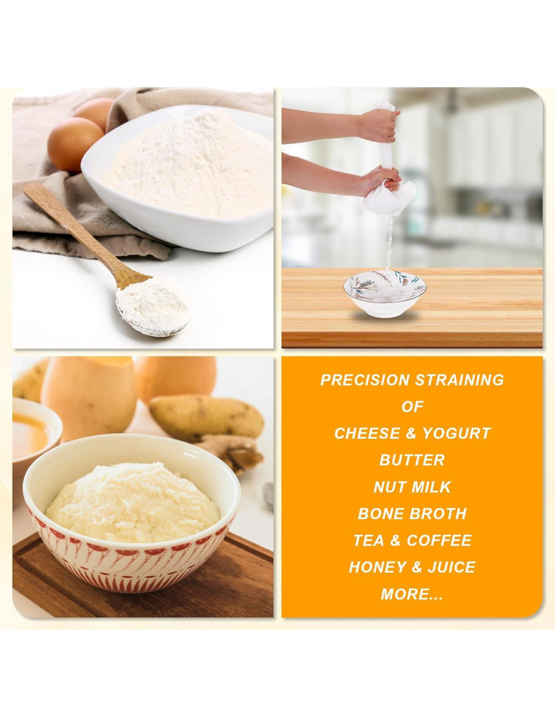 - Múltiples Usos Esta bolsa de leche de nuez es una herramienta de cocina versátil con docenas de usos. Puede ser utilizada como un filtro de propósito general, filtro universal para licuadoras, exprimidor de jugos casero/hacedor de yogur/hacedor de queso. Las bolsas de leche de nuez pueden ser perfectamente utilizadas para hacer leche de nuez/almendra/coco/cajú/unicornio/leche de soja nutritiva y deliciosa, yogur de planta fermentada, yogur griego, queso de nuez, caldo/jugo de fruta/vegetal/apio, bebidas de café frío, cerveza, ghee, kéfir, té, kombucha, productos de chocolate, comida para bebés, etc.
