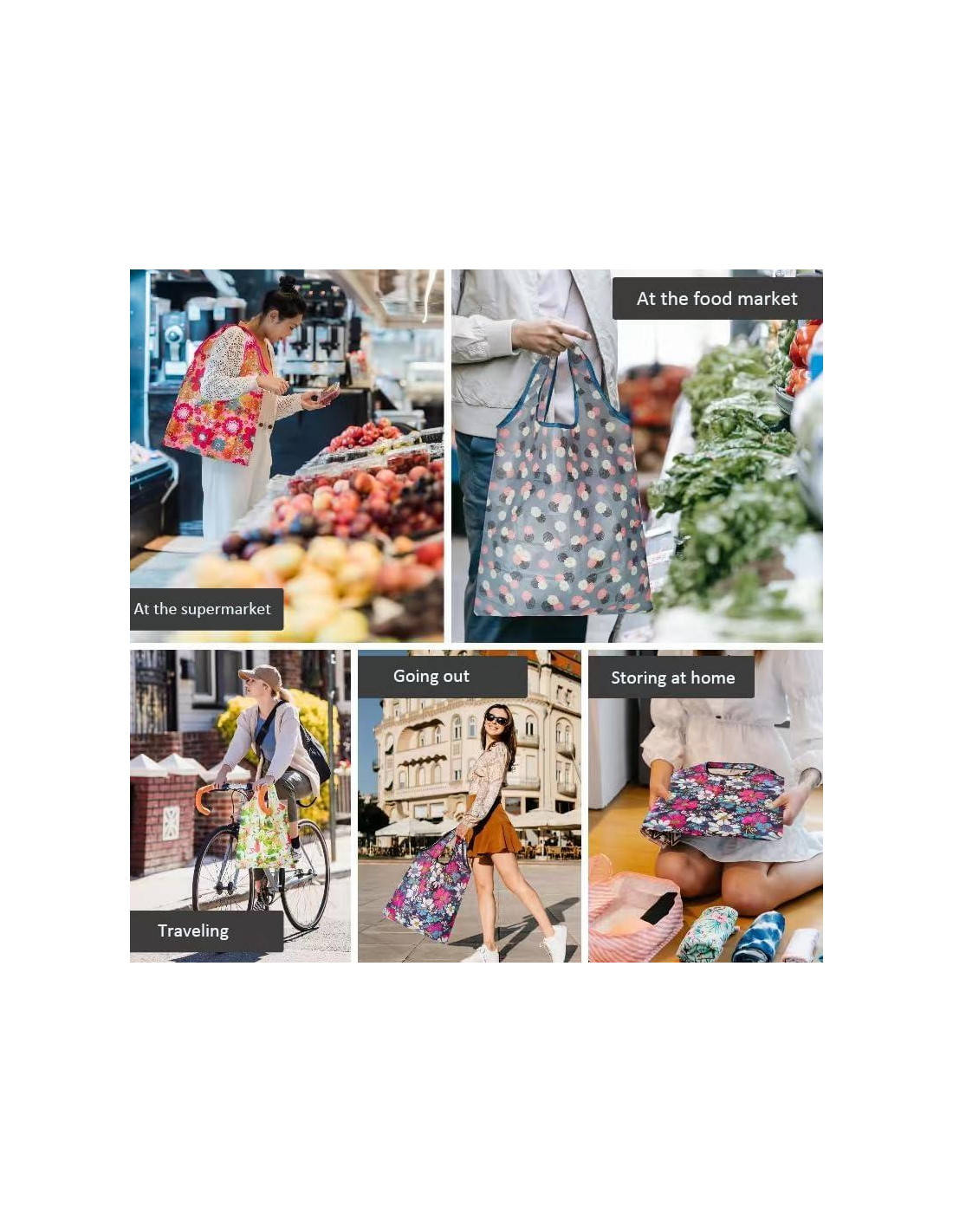 - 6 Patrones Lindos 6 pcs bolsas de compras con 6 diferentes patrones de flores especiales, presentando una estética elegante y generosa. La bolsa de compras multifuncional es perfecta para compras de comestibles, viajes, organización del hogar, camping al aire libre, etc.