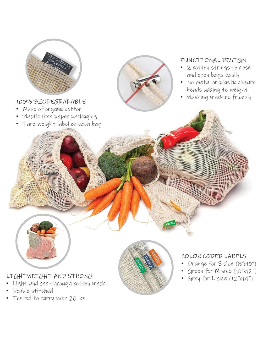 - BOLSAS DE MALLA REUTILIZABLES MULTIPROPÓSITO FÁCILES DE LIMPIAR: Nuestras bolsas de alimentos de algodón con su variedad de tamaños son muy versátiles. Geniales para el mercado de agricultores como bolsas de verduras y frutas, bolsa fresca de cebollas, para granos más grandes, legumbres secas o para tu almacenamiento en casa. 12 bolsas de productos reutilizables son geniales para almuerzos escolares, almacenamiento de juguetes, para organizar la colada o la maleta. Las bolsas de algodón sin cierres de metal no dañarán tu lavadora. Sin embargo, recomendamos lavar las bolsas de algodón a mano solo en agua fría y no secarlas en la secadora para evitar que se encojan.