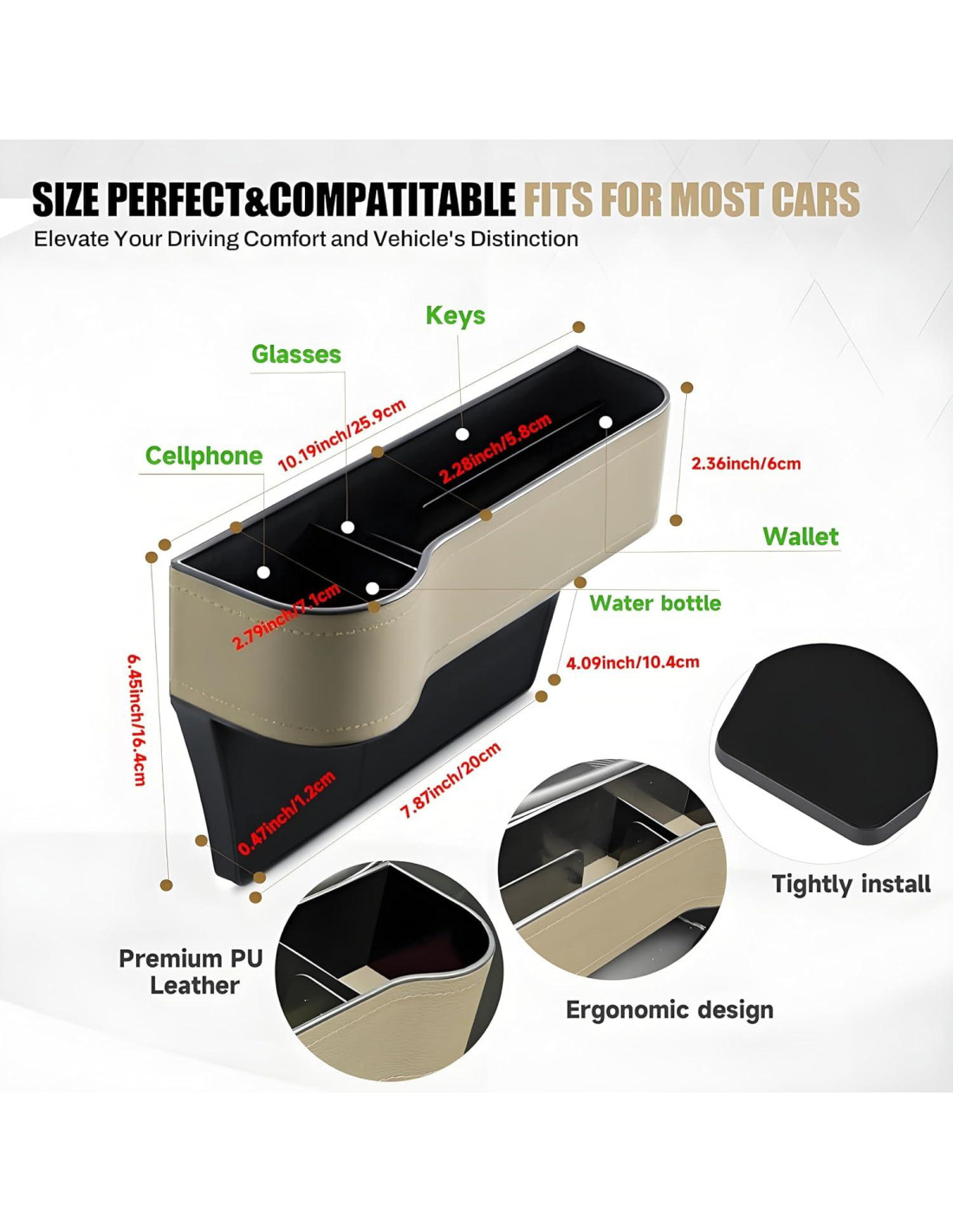 - [IMPORTANTE: LEA ANTES DE COMPRAR] - Este organizador de relleno de costura de asiento se adapta a los espacios entre asientos de coche de 1.52 cm o más anchos, ideal para consolas más bajas que el asiento. Midiendo 26.7 cm(L) * 14 cm(H) * 5.7 cm(W), con un portavasos de 7.3 cm de diámetro, es crucial medir la distancia entre su asiento y la consola antes de la compra. Asegurarse de un ajuste perfecto previene deslizamientos y maximiza el almacenamiento, ¡sin conjeturas necesarias!