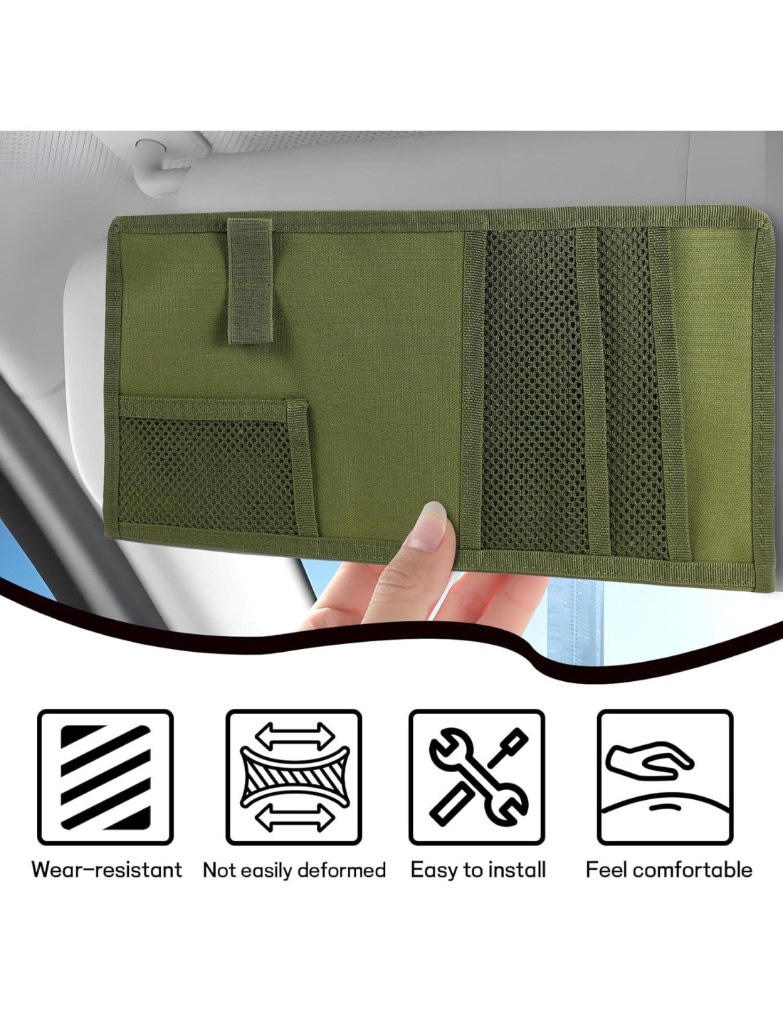 Especificación: Material: Tela Oxford Cantidad: 1 PCS Color: Negro / Caqui / Verde Militar Característica: Organizado, Multifuncional, Ajuste Estable Tipo: Ajuste Universal ¿Por qué necesitas este organizador de visera? -Con amplio espacio, puede satisfacer tus necesidades diarias de almacenamiento. -Es tanto funcional como elegante, lo que lo hace ideal para regalar. -Tiene un aspecto simple y elegante que se mezcla bien con el interior y es plano, por lo que no interfiere con tu visión al conducir. -Diseñado para exhibir parches de moral, el panel con anillo muestra tu estilo e identidad únicos, añadiendo un toque personalizado al interior de tu camión.