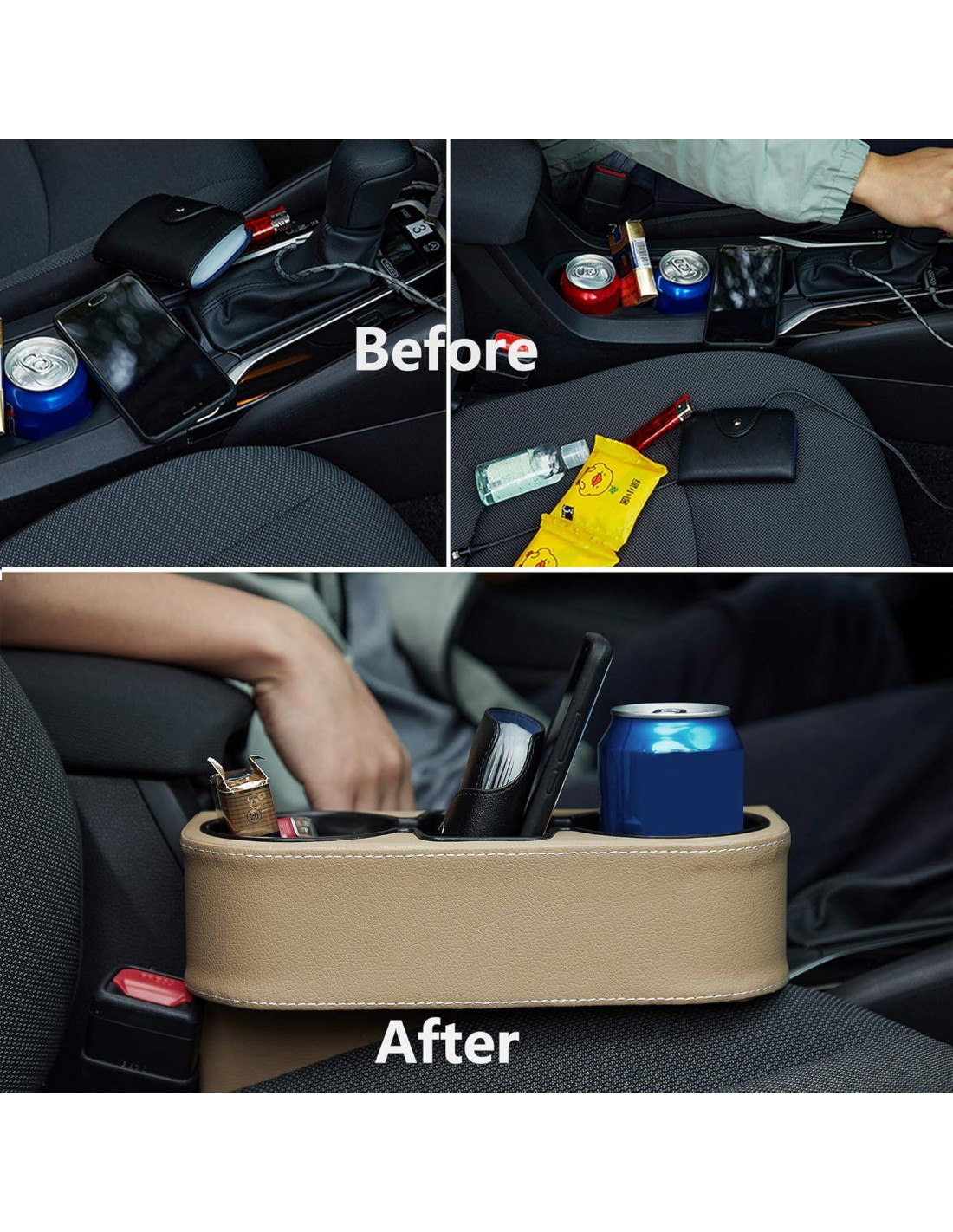 No es adecuado para la distancia entre el asiento y la consola central que sea demasiado ancha o demasiado estrecha. Referencia al tamaño ofrecido arriba. Si su instalación afecta su conducción segura. O si le importa si es demasiado grande. Por favor, no lo use. Verifique el tamaño antes de comprarlo. Porque esto ocuparía mucho espacio en su auto. No es adecuado para el auto que tiene la consola central más baja que el asiento o la consola central mucho más alta que el asiento. Material de piel de vaca de primera capa, gran resistencia, apariencia exquisita, textura lujosa. Cuidadosamente elaborado en cada esquina. Gran calidad, tecnología de costura superior, fuerte resistencia al desgaste y hermosa apariencia. El interior está hecho de material Tritan. Seguro e higiénico, resistente a altas y bajas temperaturas, duradero. Instalación no destructiva, llenando el espacio entre la palanca de cambios y el asiento. Tres diseños diferentes de contorno de taza, adecuados para múltiples tipos de tazas diferentes. Relleno de espacio entre el asiento del auto, excelente para mantener organizados sus artículos necesarios para un viaje agradable.