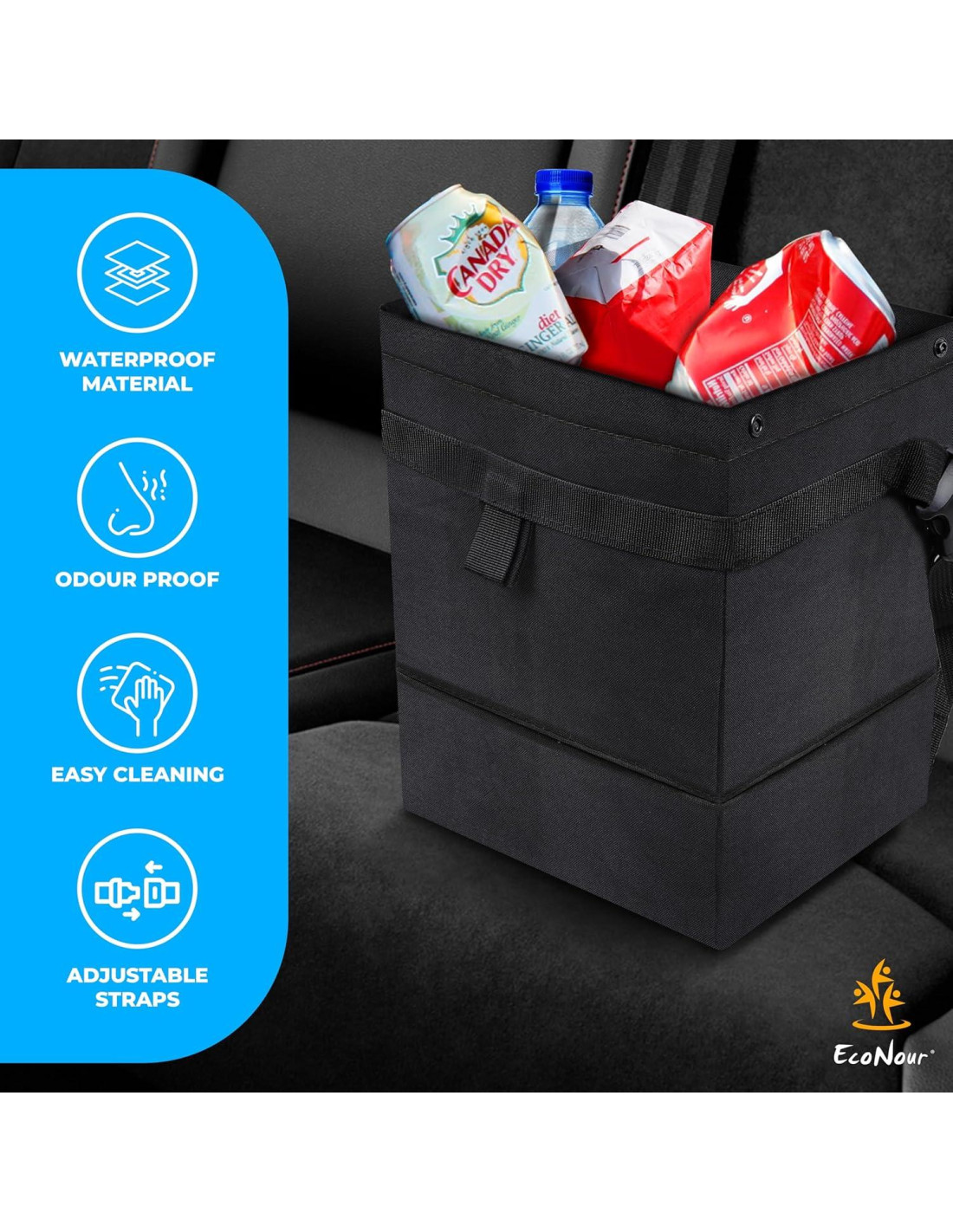 - ALMACENAMIENTO A PRUEBA DE FUGAS: La Bolsa de Basura para Auto Econour se utiliza para desechar de manera segura la basura y los artículos húmedos con el interior impermeable de 9.5 litros (2.5 galones), previniendo derrames y olores.
