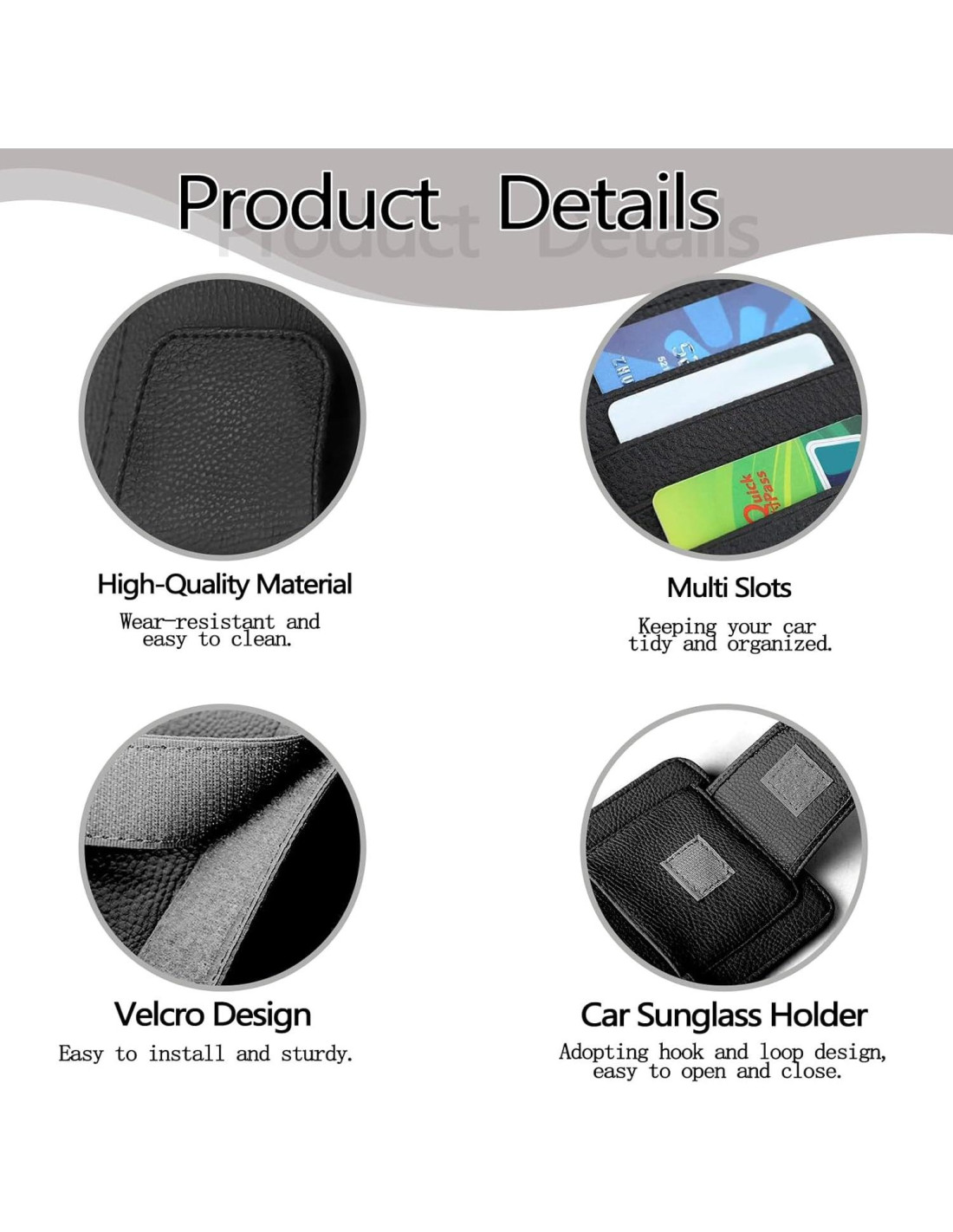 Características del Producto - Fácil de Usar Soporte para Gafas de Sol de Coche: El soporte para gafas de sol para coche adopta un diseño de gancho y bucle, que es fácil de abrir y cerrar, y conveniente de usar. - Función de Almacenamiento Potente: El organizador de visera para camiones puede contener recibos, boletos de estacionamiento, boletos de lotería, cupones, listas de compras, tarjeta de gasolina, tarjeta de seguro y registro, etc. - Versátil: El organizador de coche puede ser utilizado como soporte de registro y seguro de coche, clip para gafas de sol de visera, soporte de documentos de coche, soporte para bolígrafo de coche, soporte de tarjeta de visera. - Conducción Segura: El organizador de almacenamiento de coche es super compacto y no ocupa toda la visera, interfiere con la operación de la visera, o impide la vista del conductor.