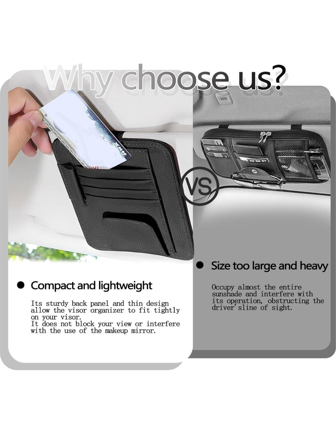 - Mantener Ordenado: El organizador de visera se adapta a la mayoría de las viseras de coches, SUV y camiones. Puede mantener sus documentos importantes fácilmente al alcance, ahorrando espacio mientras mantiene su coche ordenado y organizado, haciendo que su conducción sea más cómoda y enfocada.