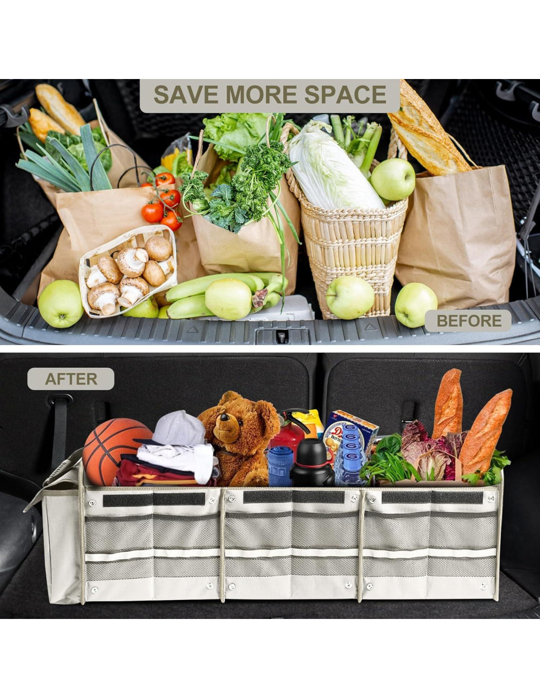 - Organizador de maletero expandible: Este organizador de maletero con tapa tiene 3 compartimentos y puedes ajustar su tamaño quitando los divisores. También tiene 6 bolsillos de malla y 1 bolsillo con solapa, puede contener más artículos. Cuando el organizador de almacenamiento del maletero no está en uso, se puede plegar al mismo tamaño que una bolsa de laptop ordinaria, lo que no ocupará espacio en tu coche.