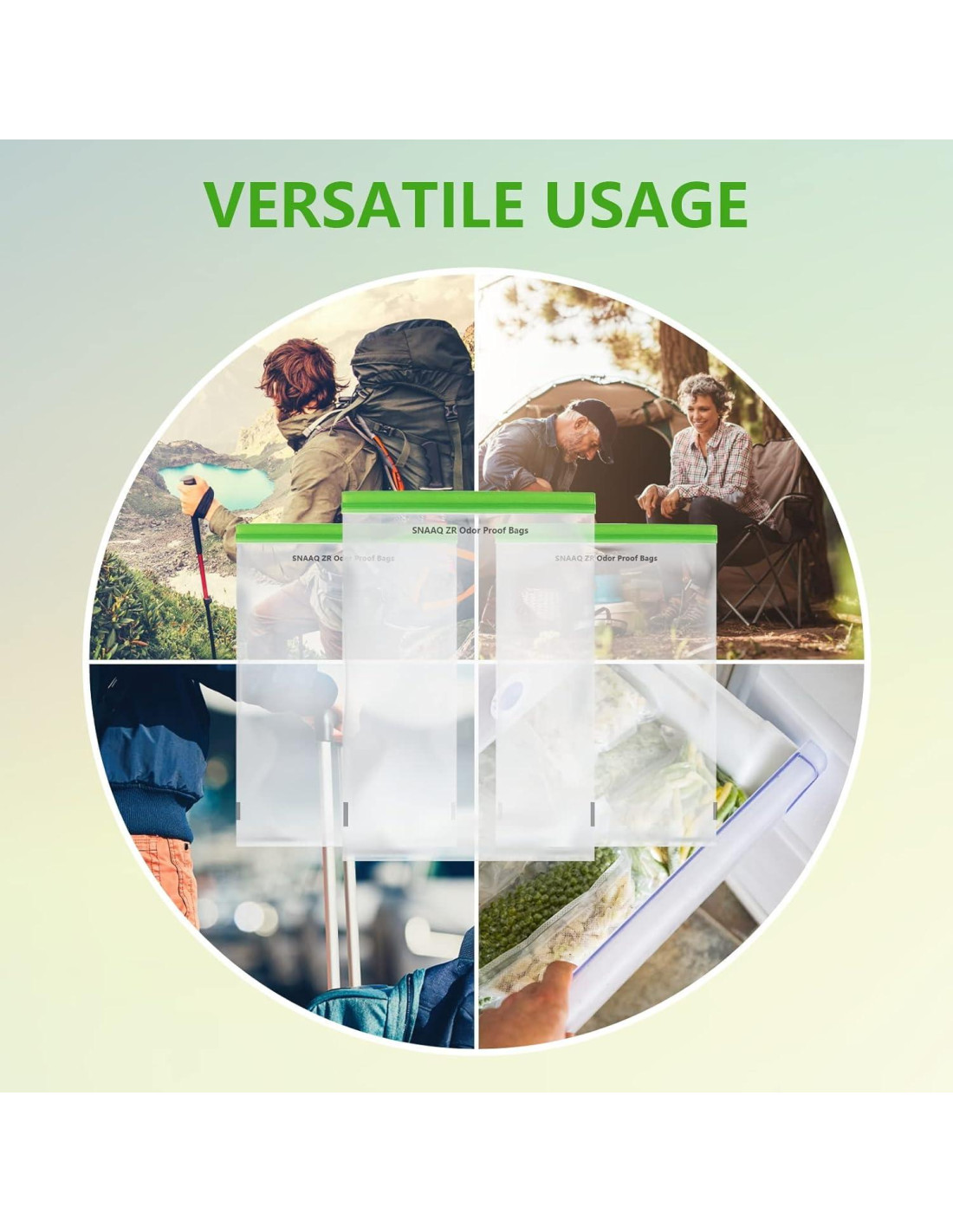 - MANTEN ALIMENTOS FRESCOS Las Bolsas de Almacenamiento a Prueba de Olores SNAAQ ZR evitan que los alimentos sensibles al aire se pongan rancios. Mantén tus carnes, verduras, frutas y panes frescamente almacenados para alargar la vida útil de los alimentos, y mantén los paquetes de bolsas de barrera abiertos cubiertos para evitar que los alimentos se pongan rancios o se derramen.