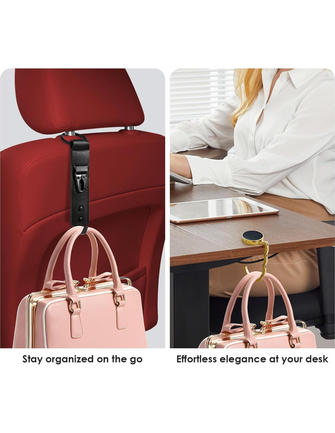 - Juego de ganchos para bolso de doble uso - Conveniencia para coche y mesa. Cada juego incluye 2 ganchos para bolso de regalo para mesas, perfectos para la oficina, cafeterías o restaurantes. Protege tu bolsa de suelos sucios y mantenla al alcance dondequiera que vayas.