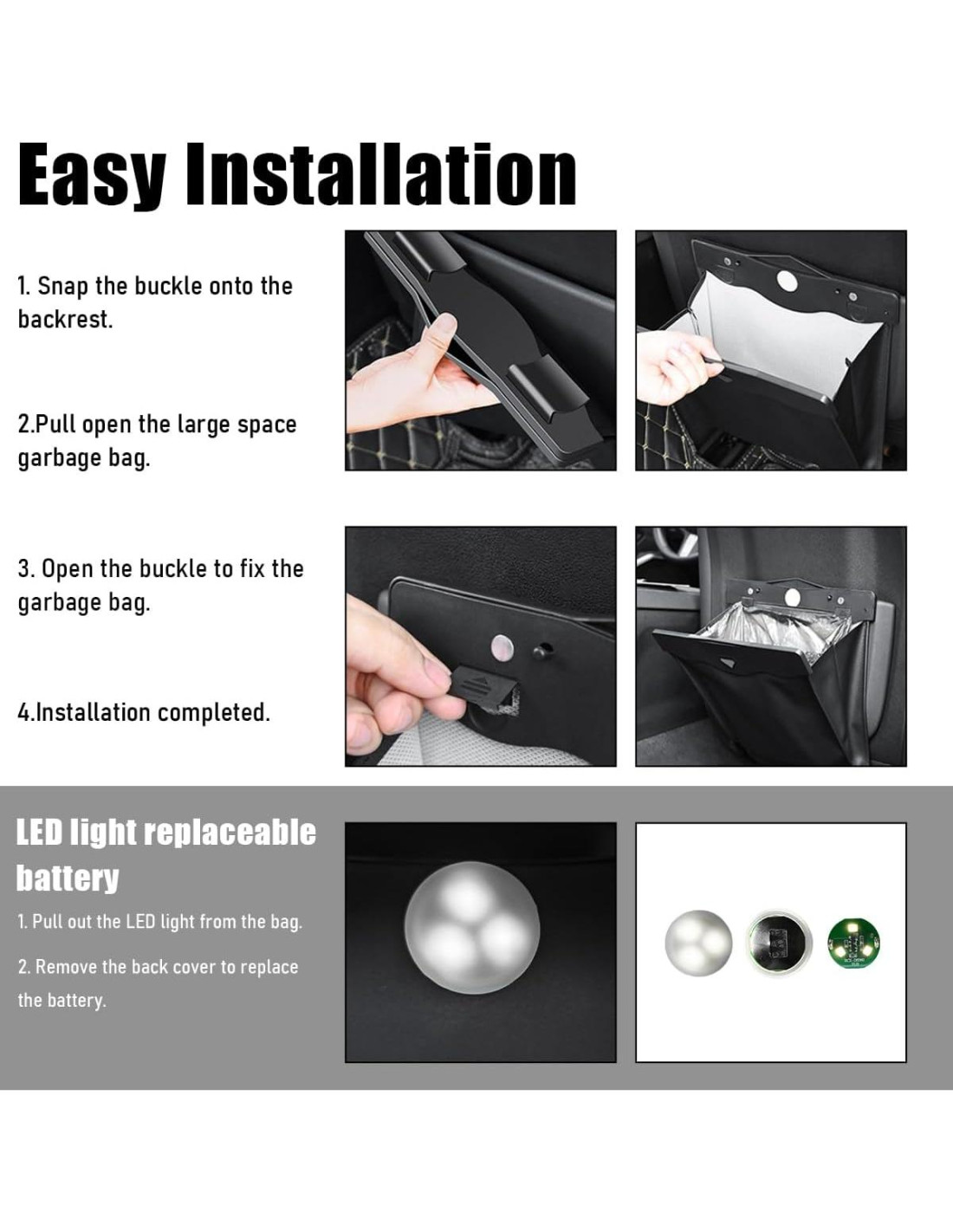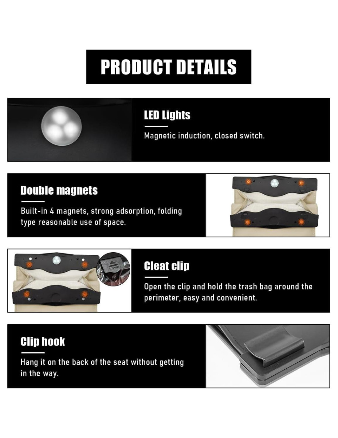 - [Diseño Innovador] : La bolsa de basura con cierre magnético puede prevenir derrames o fugas accidentales que podrían ensuciar el interior de su auto. La luz LED que la hace destacar de las tradicionales proporciona iluminación en entornos oscuros o poco iluminados, facilitando encontrar y usar la bolsa de basura.