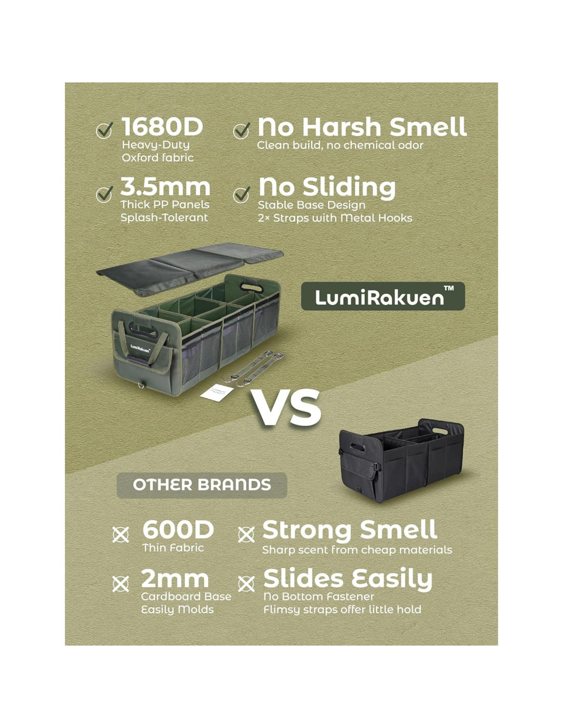 - Calidad duradera Hecho con tela Oxford 1680D (en lugar de 600D) y paneles de base firmes de 3.5mm (reemplazando cartón de 2mm), este organizador de maletero extra grande es un imprescindible entre los accesorios de auto, ofreciendo un fuerte soporte, construcción resistente a salpicaduras y sin olores fuertes.