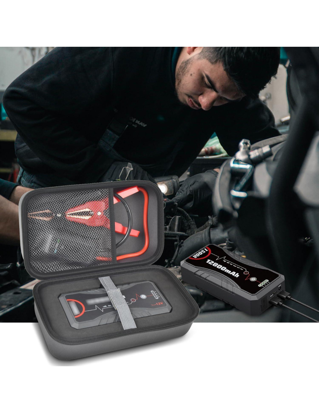 - Funda protectora humanizada y razonable para cargador de batería automotriz: Caja con bandeja interna de esponja personalizada que se ajusta perfectamente al arrancador de coche, viene con una banda elástica que puede mantenerlo en su lugar sin moverse ni sacudirse y fácil de sacar y usar. El bolsillo de malla interior puede expandir el espacio de almacenamiento para cables de arranque inteligentes, cable de carga USB tipo C y más accesorios, que es fácil de encontrar y usar, extiende la vida útil del arrancador de coche.