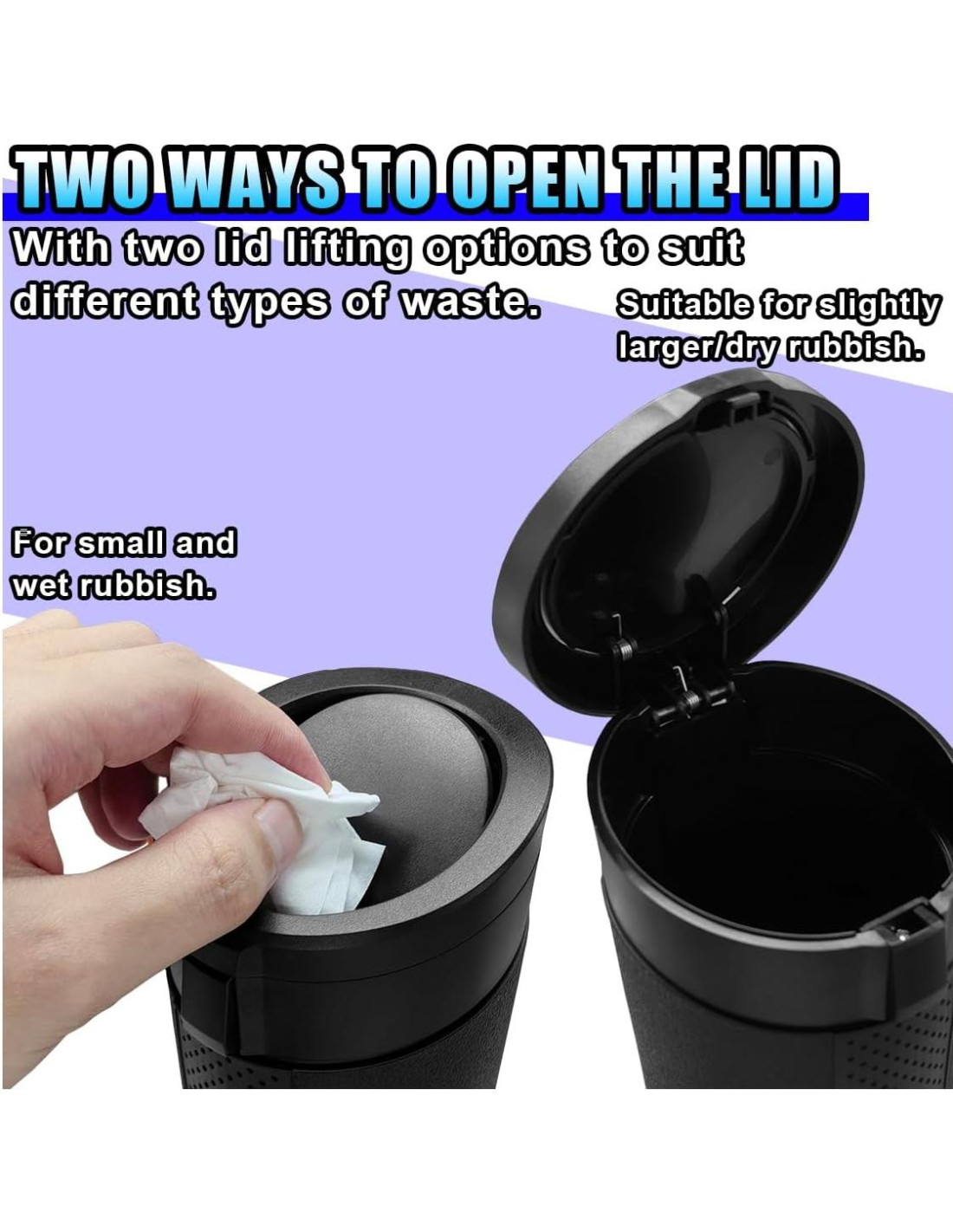 - [Seguro y Conveniente] : Este bote de basura para auto se puede abrir instantáneamente con un ligero empujón o presión de un botón, permitiendo una operación con una sola mano. Esto previene distracciones mientras conduces y mejora efectivamente la seguridad al conducir.